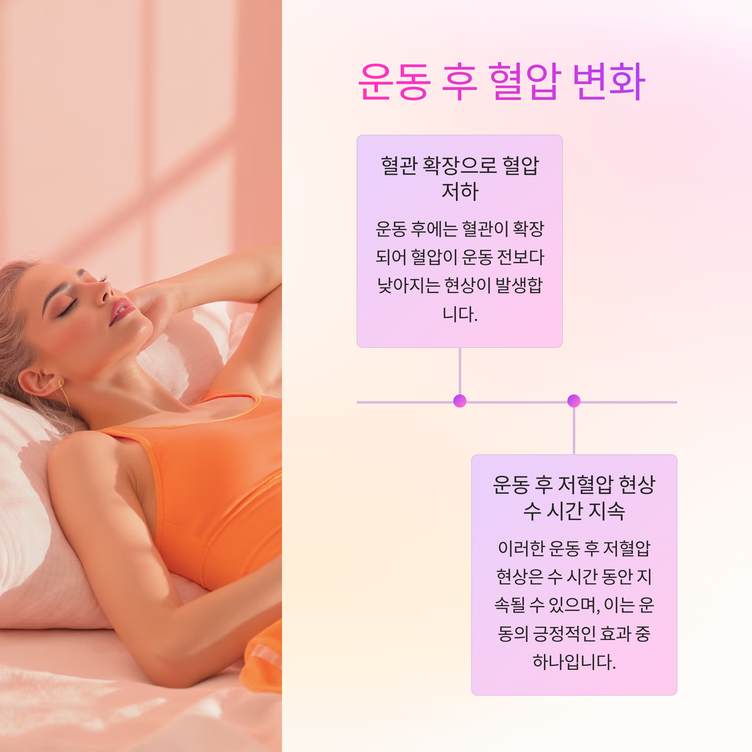 운동 직후에는 혈관이 확장되면서 혈압이 평소보다 낮아질 수 있습니다. 이를 운동 후 저혈압 현상이라고 부르며, 보통 수 시간 동안 지속됩니다. 규칙적으로 운동을 하면 이 효과가 누적되어 장기적으로 혈압을 안정화시키는 데 큰 도움이 됩니다. 따라서 운동 후에는 충분히 수분을 섭취하고, 갑작스럽게 눕거나 앉지 말고 가벼운 스트레칭으로 회복 시간을 갖는 것이 좋습니다.