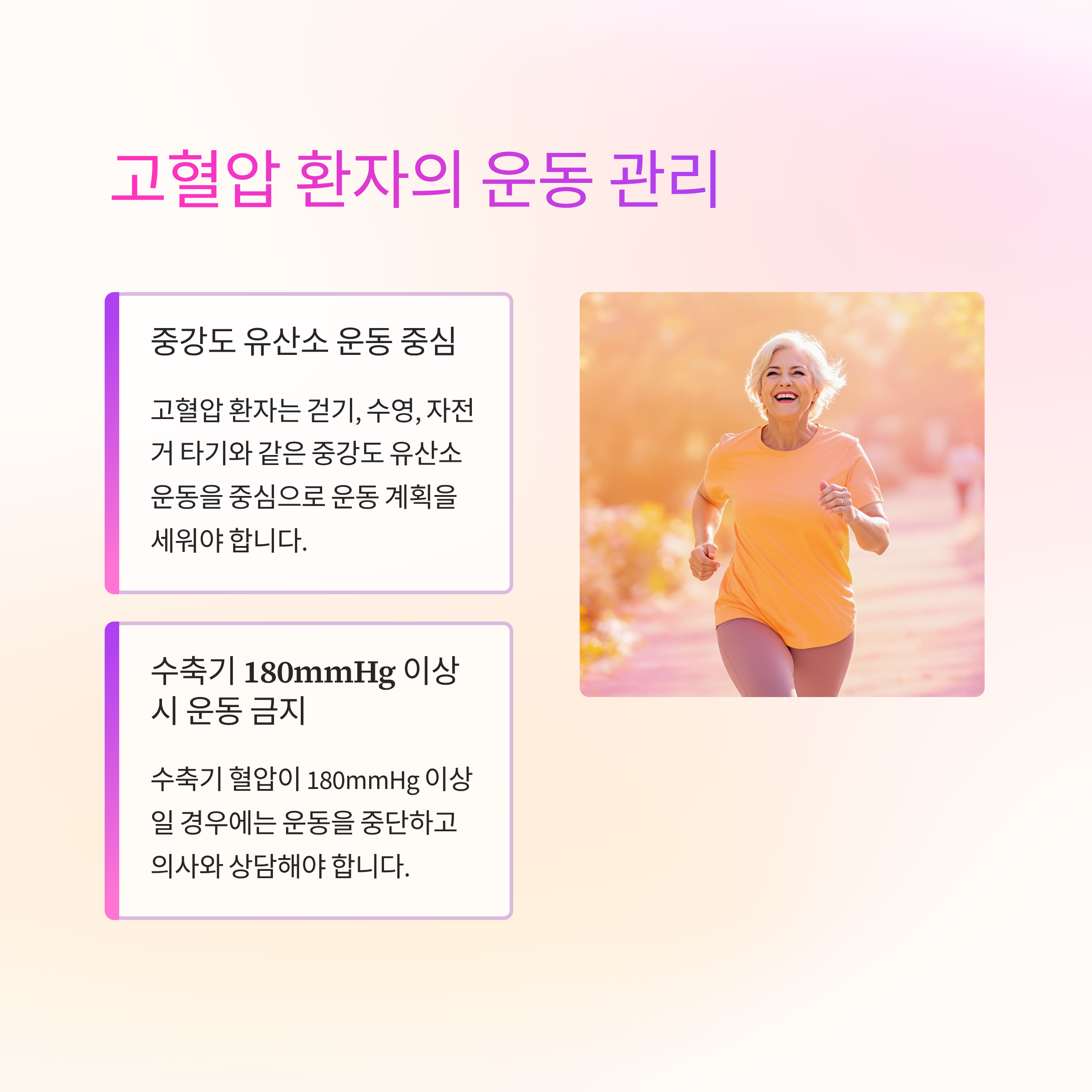 고혈압 환자는 격렬한 근력 운동보다는 중강도 유산소 운동을 중심으로 해야 합니다. 빠르게 걷기, 가벼운 자전거 타기, 수영 등이 추천됩니다. 운동 전후 혈압을 반드시 체크하고, 수축기 혈압이 180mmHg 이상일 경우 운동을 피하는 것이 안전합니다. 또한 숨을 참는 발살바 호흡은 혈압을 급격히 올릴 수 있으므로 피해야 합니다.