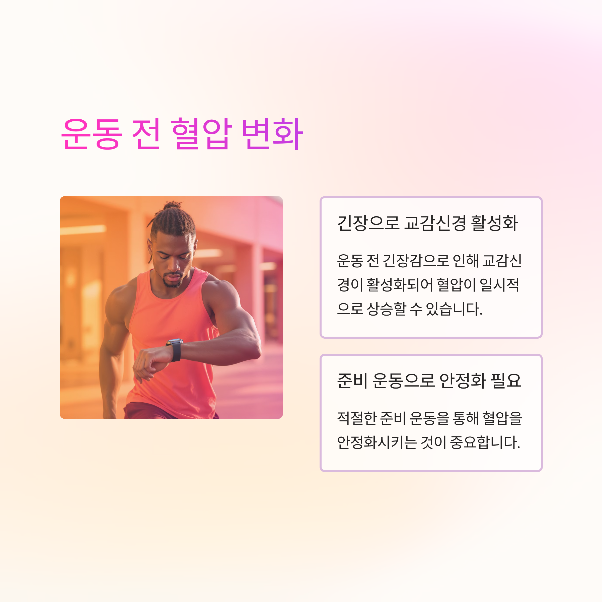 운동 전에는 긴장과 기대감 때문에 교감신경이 활성화되어 혈압이 약간 상승할 수 있습니다. 이는 일시적인 반응으로 큰 문제가 되지 않습니다. 다만 이미 혈압이 높은 상태라면 격렬한 운동을 바로 시작하기보다 가벼운 준비 운동으로 심박수와 혈압을 서서히 조절하는 것이 중요합니다.