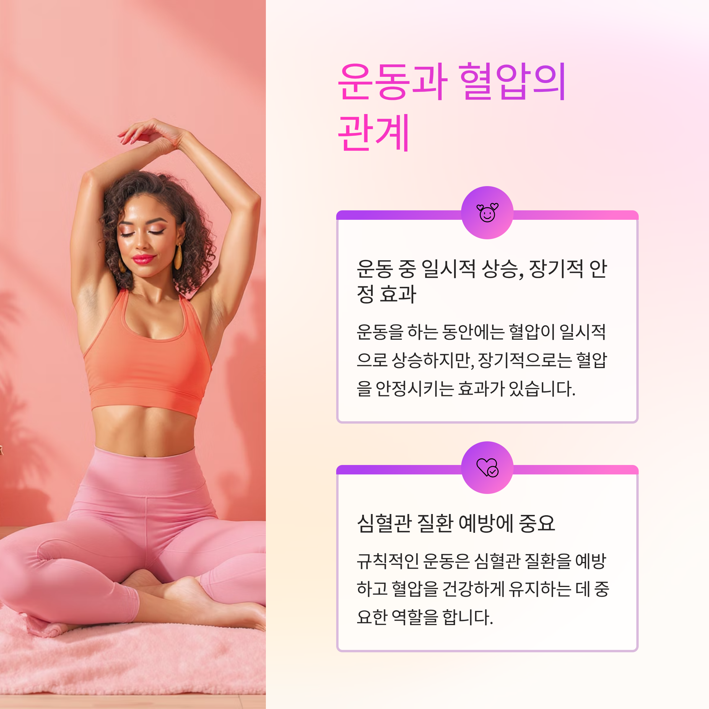 A1. 운동 중에는 일시적으로 오르지만, 장기적으로는 오히려 혈압을 낮추는 효과가 있습니다.
