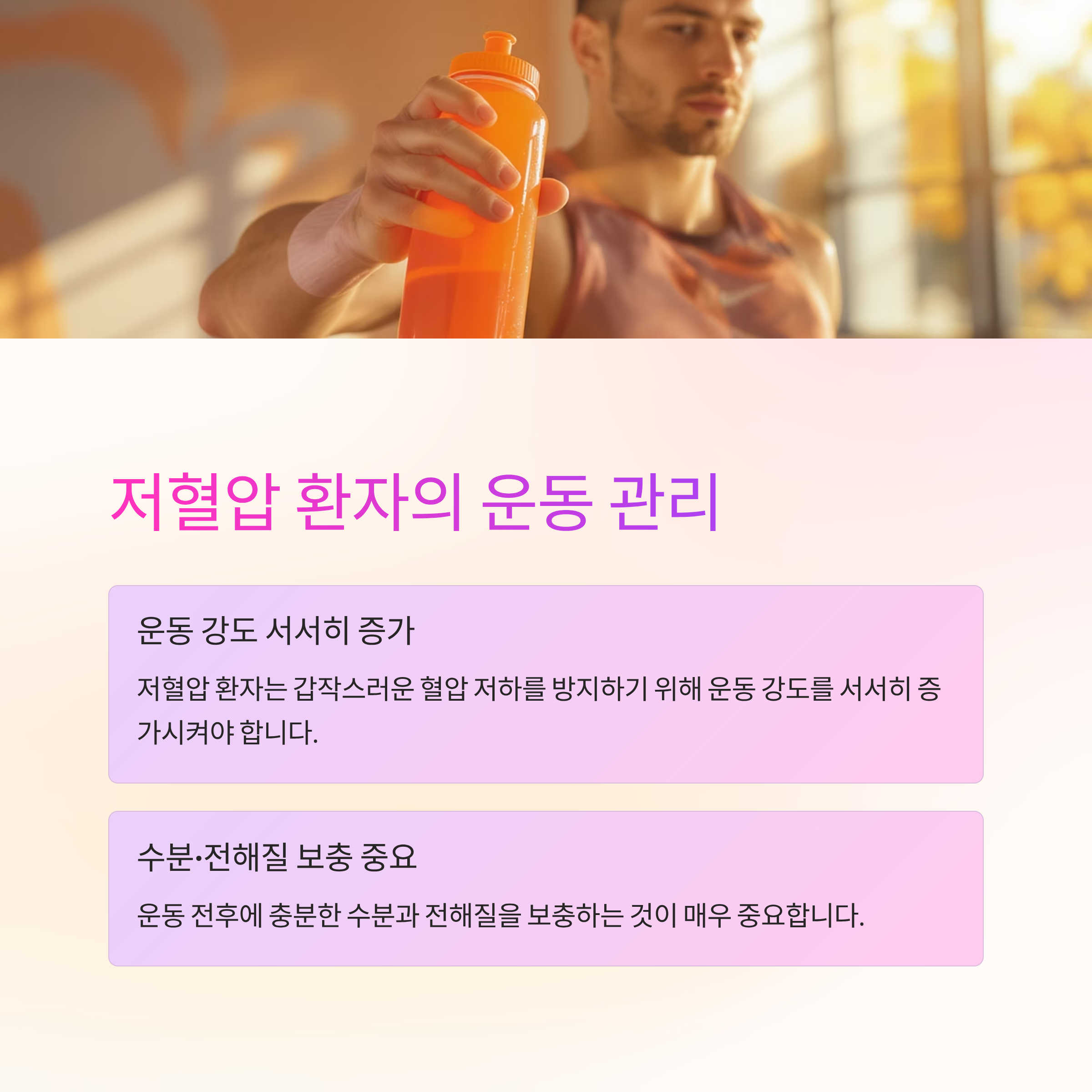 저혈압 환자는 운동 후 갑작스러운 혈압 저하에 주의해야 합니다. 따라서 운동 강도를 천천히 올리고, 마무리 단계에서 충분한 정리 운동을 하는 것이 중요합니다. 또한 수분과 전해질 보충을 통해 혈액 순환을 안정적으로 유지해야 하며, 어지럼증이 심하다면 운동을 중단하는 것이 좋습니다.