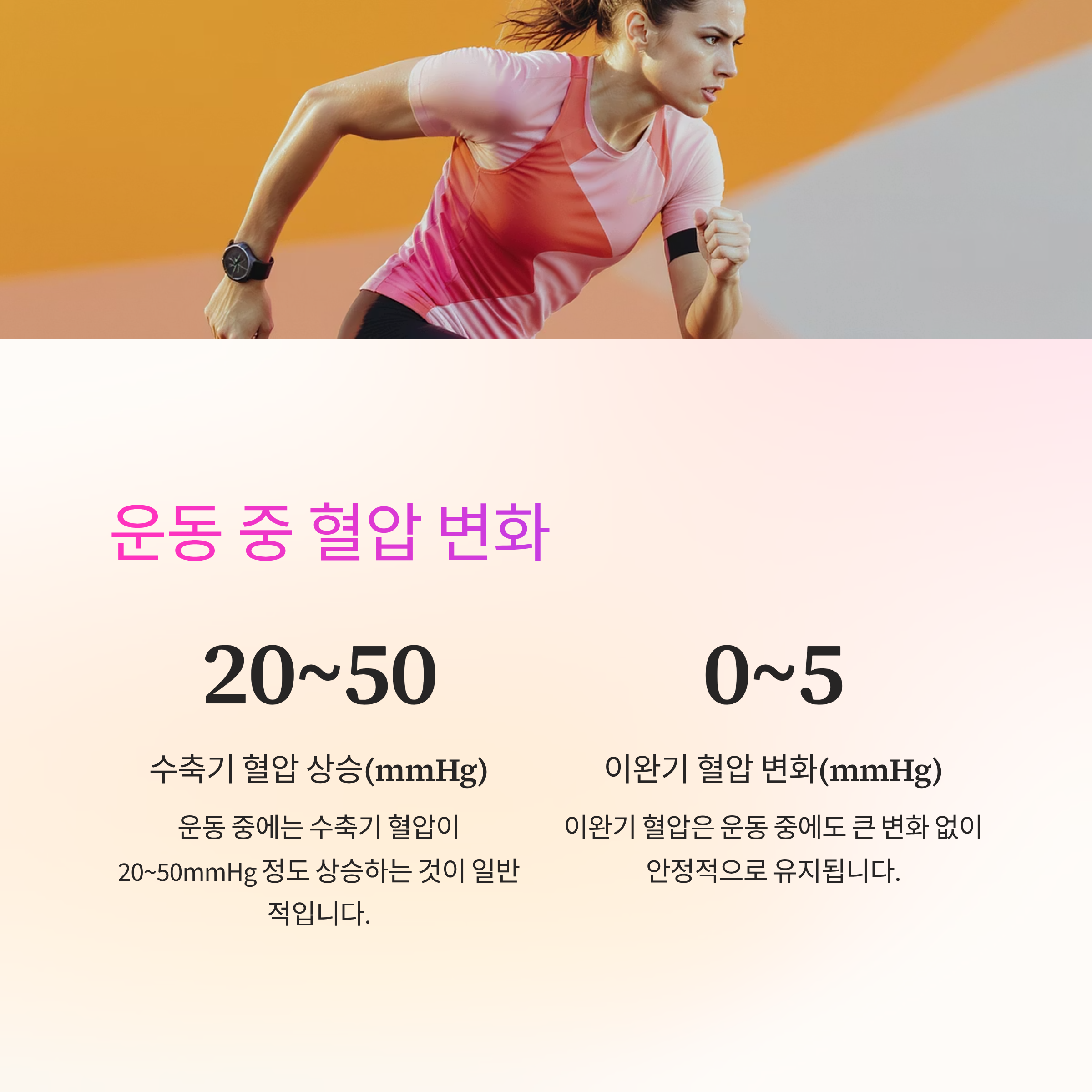 유산소 운동을 할 때는 수축기 혈압(최고혈압)이 점차 상승하는 것이 정상입니다. 보통 20~50mmHg 정도 오르며, 이는 근육에 산소를 공급하기 위한 자연스러운 반응입니다. 반면 이완기 혈압(최저혈압)은 큰 변화가 없거나 약간 감소할 수 있습니다. 하지만 무거운 중량을 드는 근력 운동 중에는 혈압이 급격히 오를 수 있으므로 호흡을 멈추지 않고 규칙적으로 해야 안전합니다.