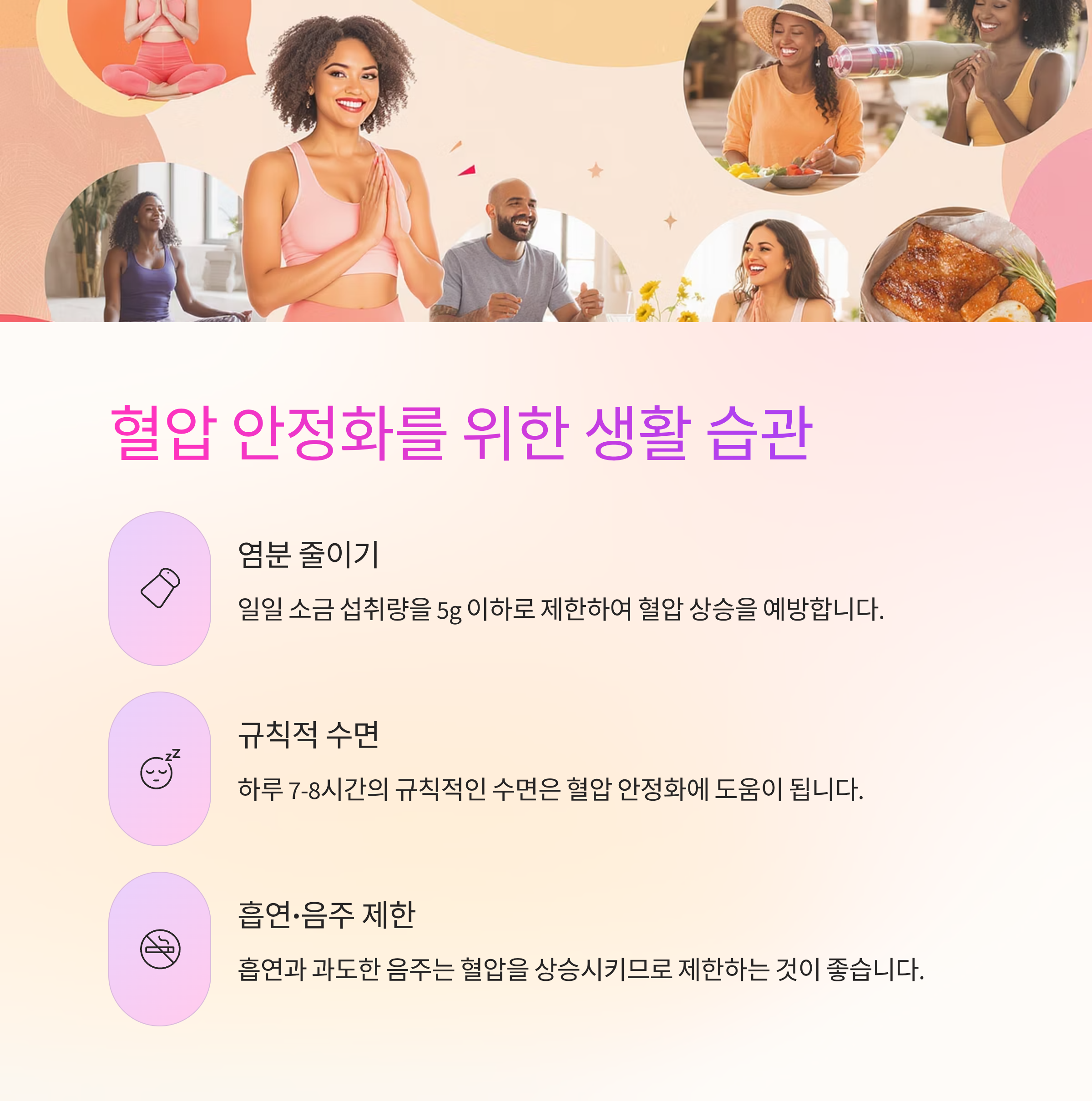 혈압은 단순히 운동만으로 관리되는 것이 아닙니다. 염분을 줄인 식단, 규칙적인 수면, 스트레스 관리가 함께 이루어져야 합니다. 특히 흡연과 과도한 음주는 혈압을 불안정하게 만들기 때문에 피하는 것이 좋습니다. 또한 매일 같은 시간에 혈압을 기록하는 습관을 들이면 건강 관리에 큰 도움이 됩니다.