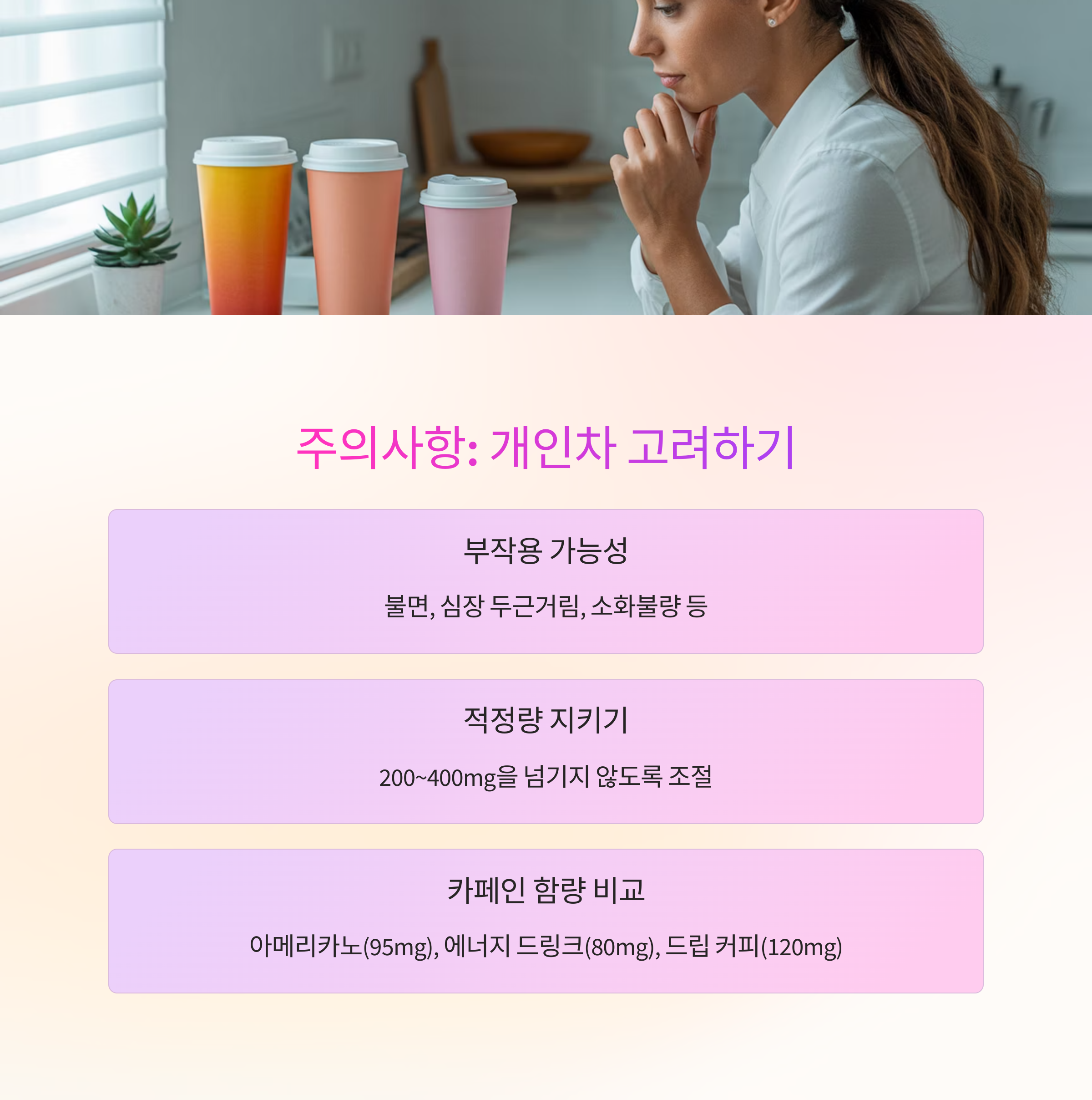 카페인에 민감한 사람은 불면, 심장 두근거림, 소화불량 등을 경험할 수 있습니다.