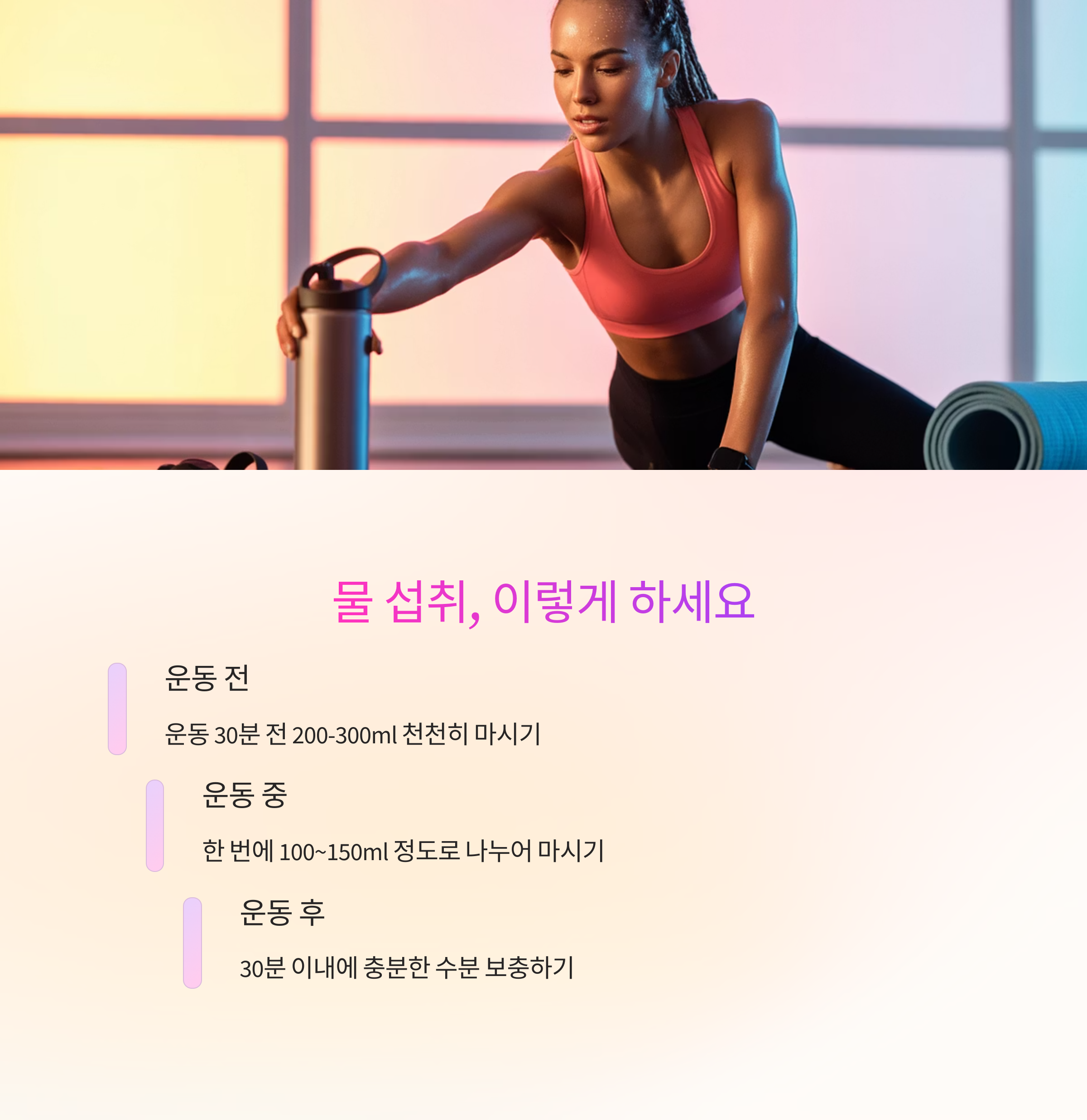 소량씩 자주 섭취하는 것이 핵심입니다. 운동 전후 수분 보충도 중요하지만,