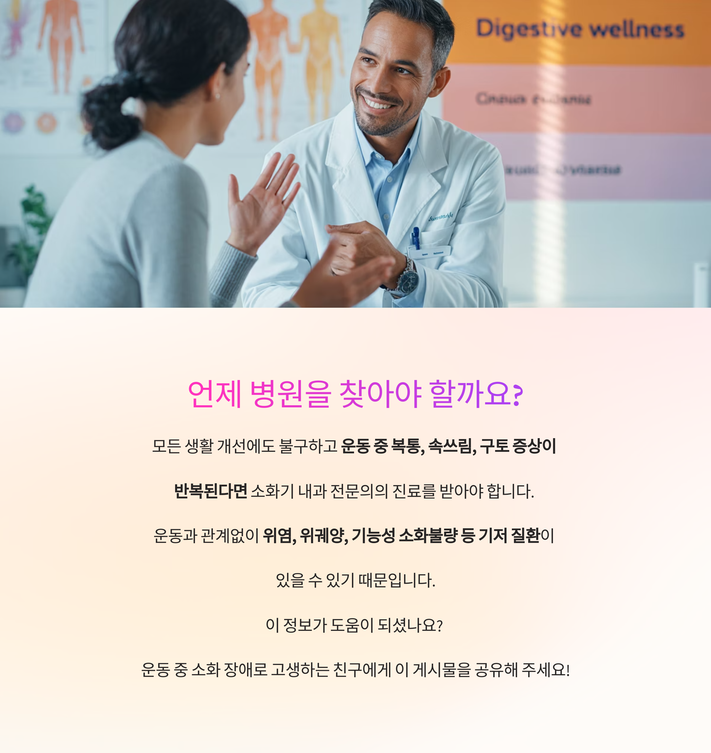 모든 생활 개선에도 불구하고 운동 중 복통, 속쓰림, 구토 증상이 반복된다면
