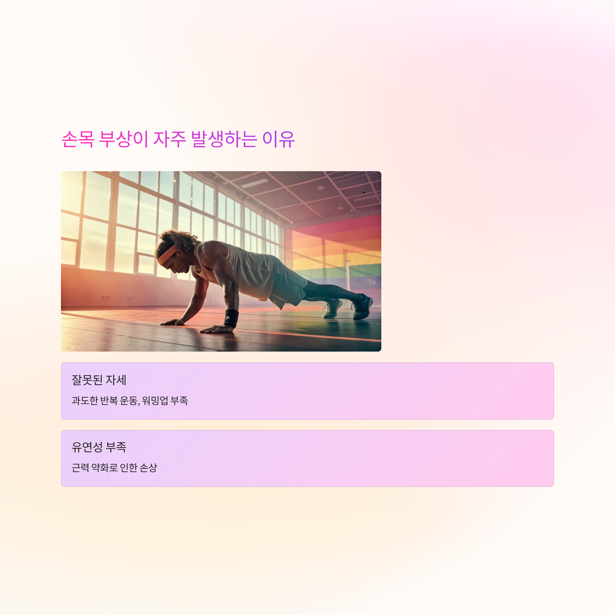 4️⃣ 손목의 유연성 부족 또는 근력 약화 이러한 요인들이 복합적으로 작용하면 염좌, 건초염, 피로 골절 등의 부상이 생길 수 있습니다.