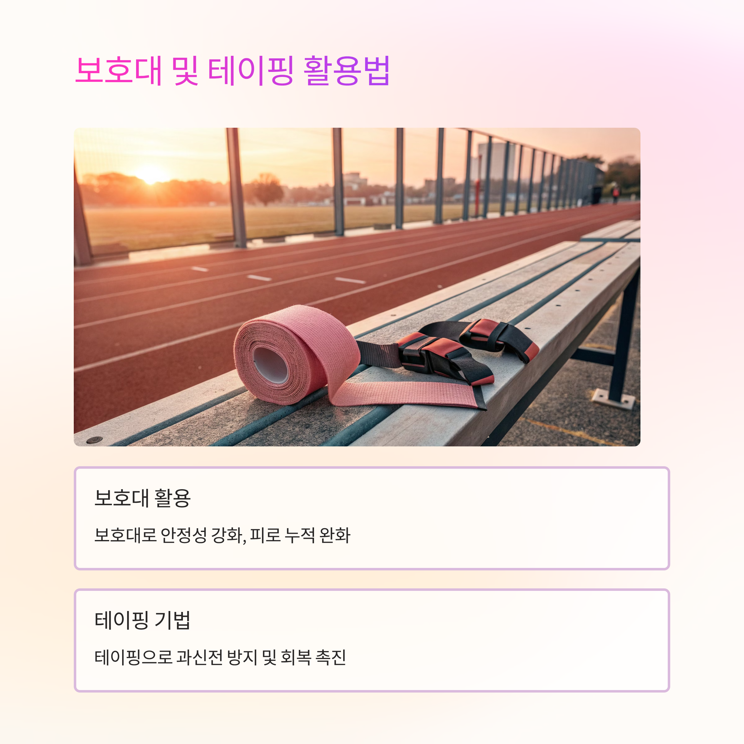 - 압박 밴드: 혈류를 조절해 부종 방지 및 회복 촉진 다만 보호장비에 의존하기보다, 근력과 유연성을 함께 강화하는 것이 근본적인 해결책입니다.