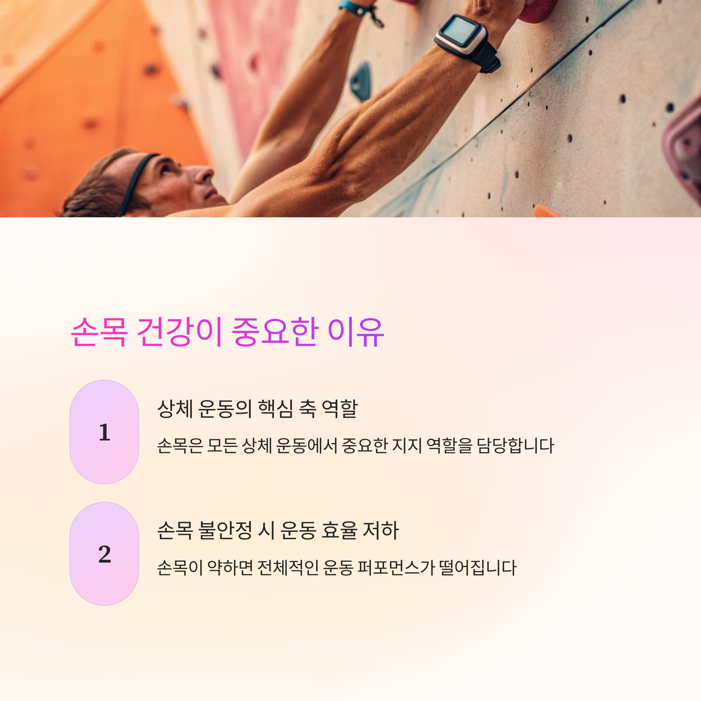 4️⃣ 손목의 유연성 부족 또는 근력 약화 이러한 요인들이 복합적으로 작용하면 염좌, 건초염, 피로 골절 등의 부상이 생길 수 있습니다.