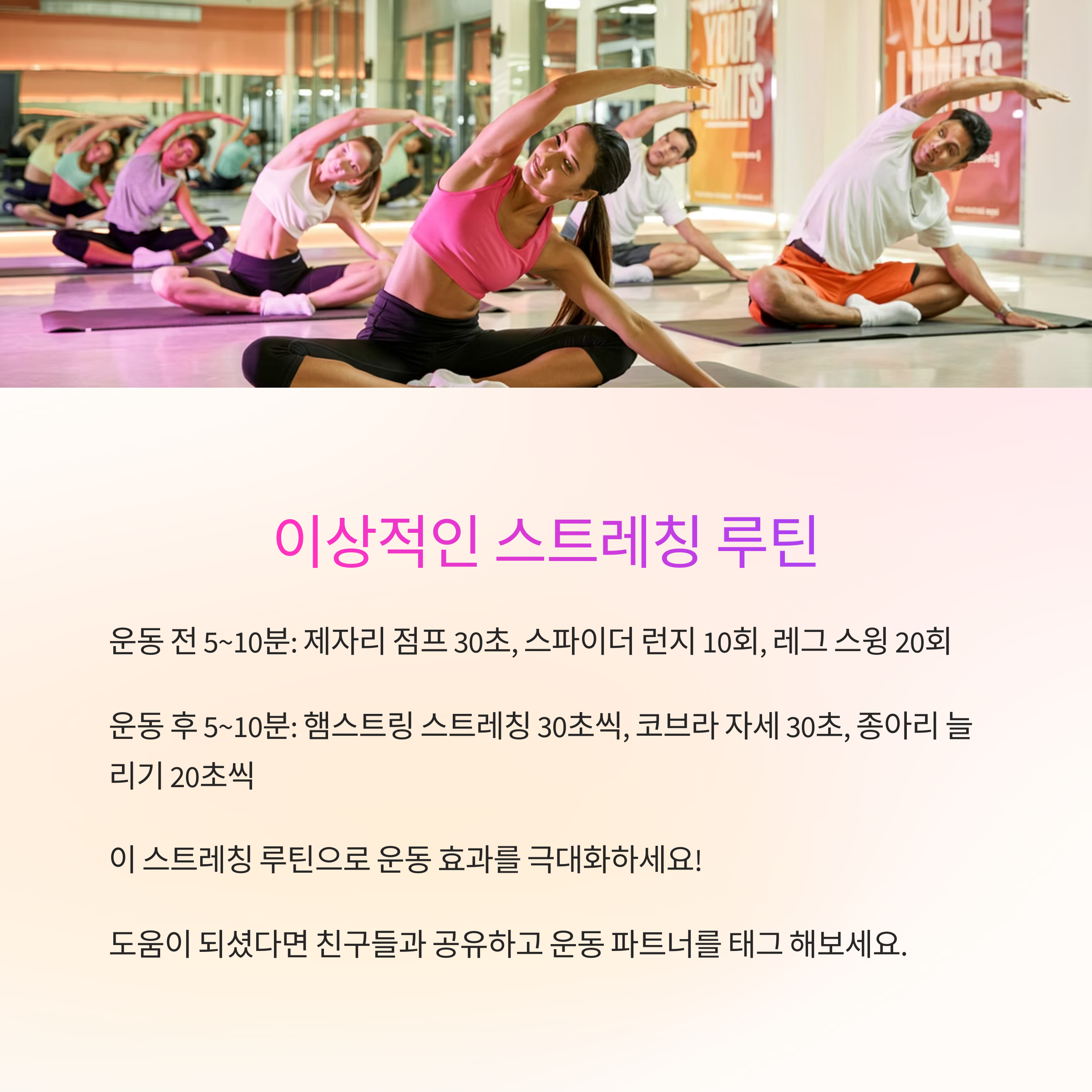 이처럼 타이밍과 목적에 따라 스트레칭 방식이 완전히 달라집니다.