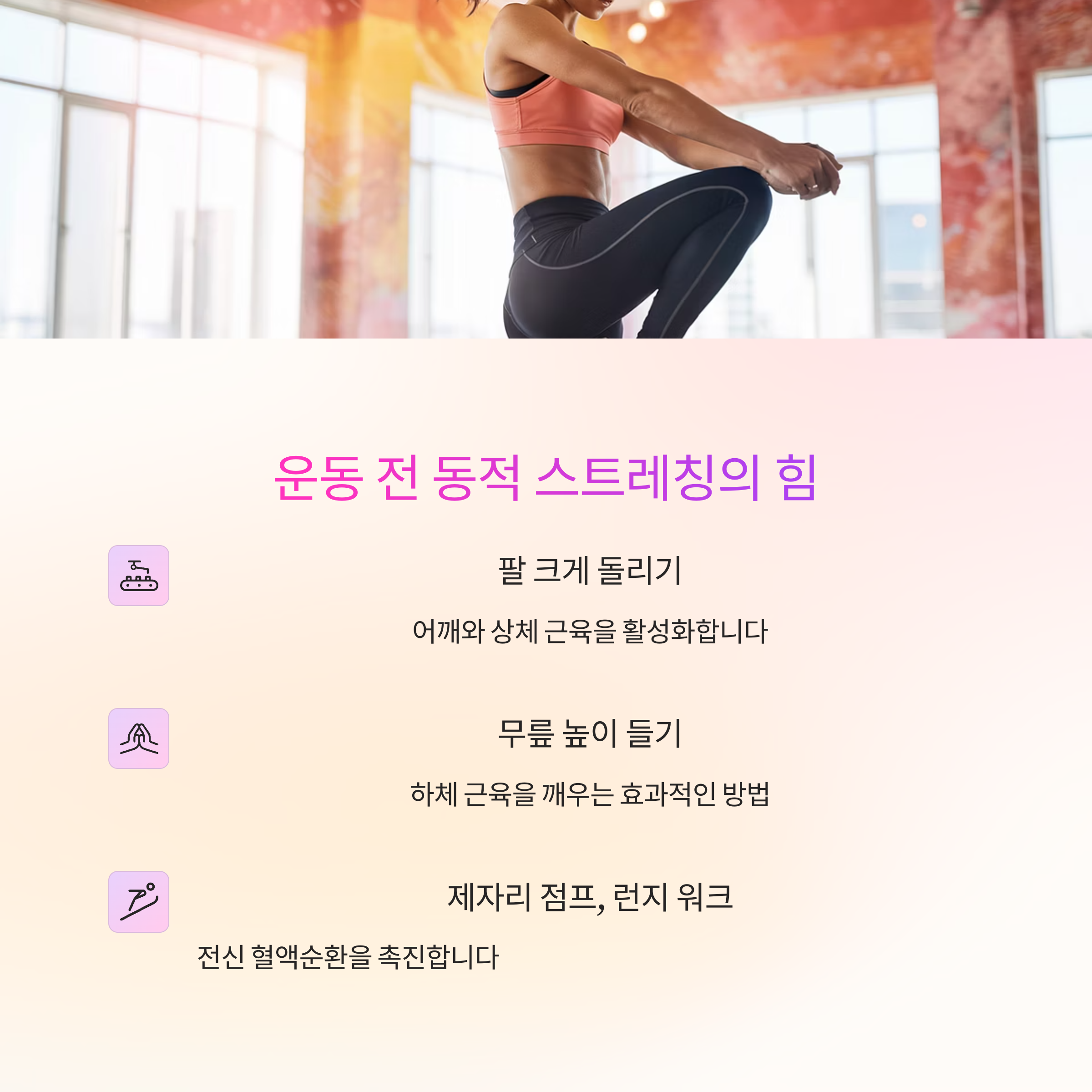 1. 운동 전, 동적 스트레칭으로 몸을 깨우세요 (움직이는 스트레칭)