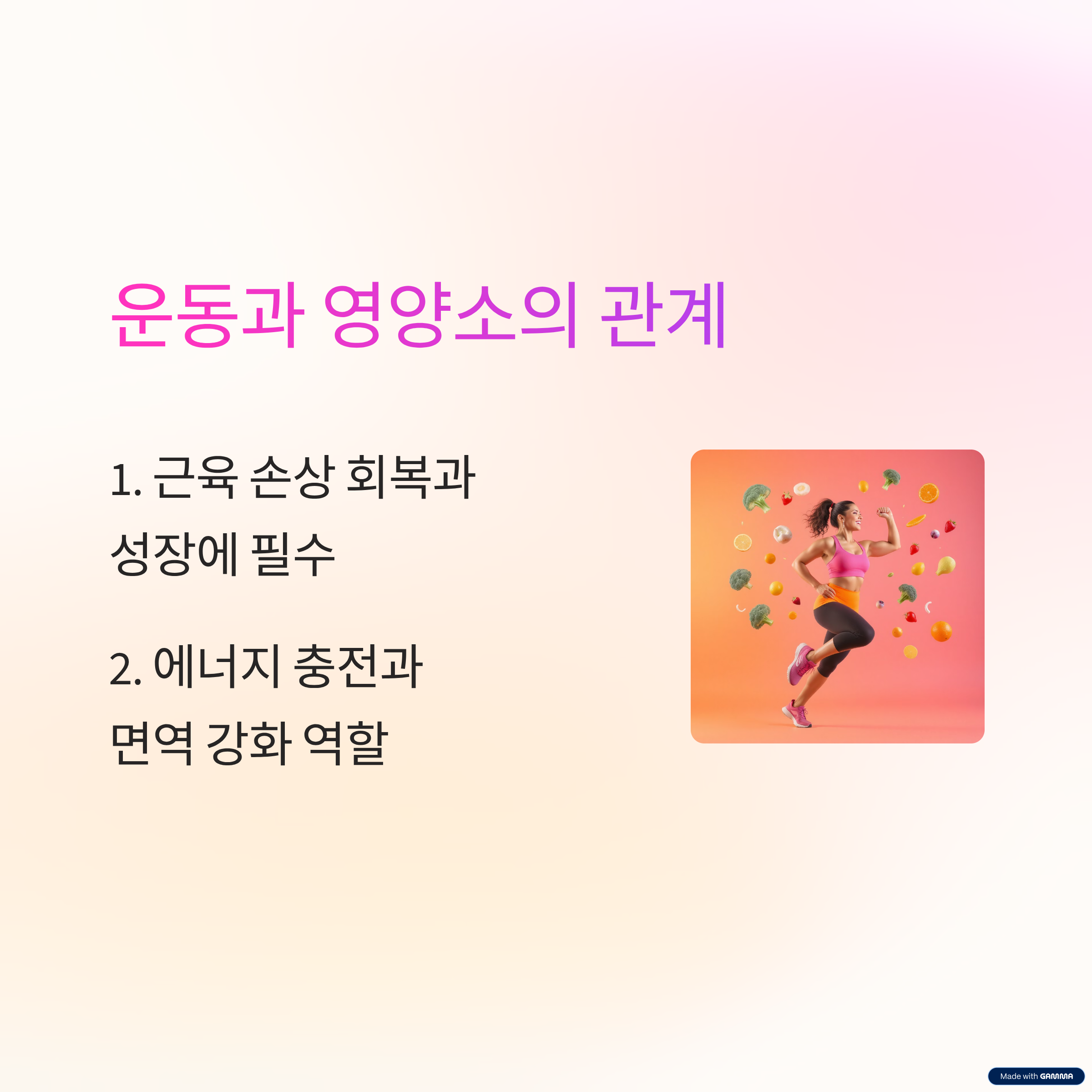 운동 중에는 근육이 미세한 손상을 입고, 에너지가 빠르게 소모됩니다. 이때 적절한 영양소를 섭취해야 근육은 다시 회복되고, 더 강하게 성장할 수 있습니다. 특히 단백질과 탄수화물의 비율은 근육 합성과 에너지 충전에 직접적인 영향을 미치며, 비타민과 미네랄은 효소 반응과 세포 기능을 지원해 전반적인 운동 성과를 좌우합니다.