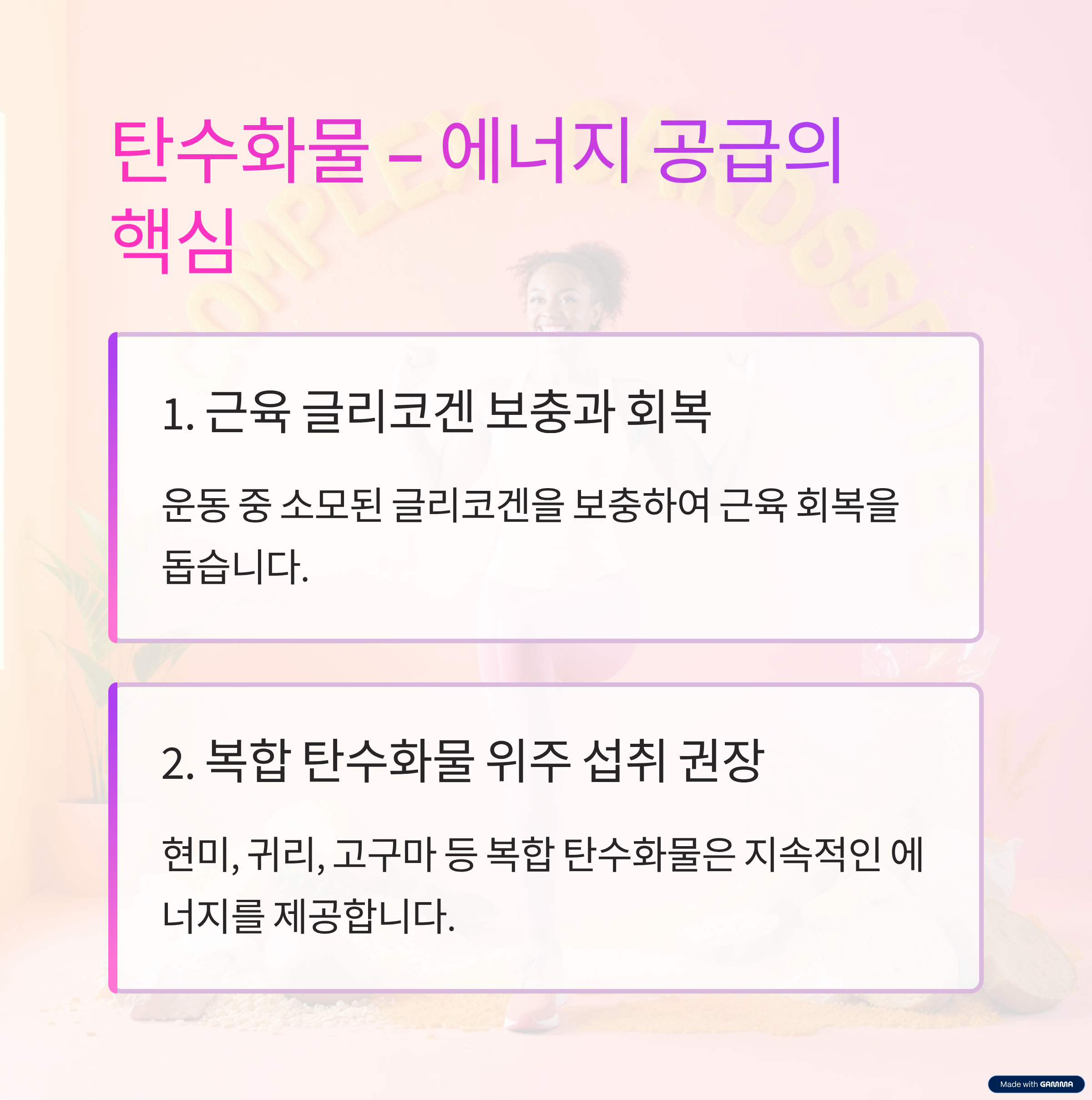탄수화물은 운동 시 가장 빠르고 효율적인 에너지원입니다. 글리코겐 형태로 근육에 저장되어 운동 중 에너지를 공급하고, 운동 후에는 빠른 회복을 돕습니다. 현미, 고구마, 귀리, 통곡물과 같은 복합 탄수화물이 안정적인 에너지를 제공하며, 운동 직후에는 흡수가 빠른 탄수화물을 소량 섭취하는 것도 회복에 도움이 됩니다.