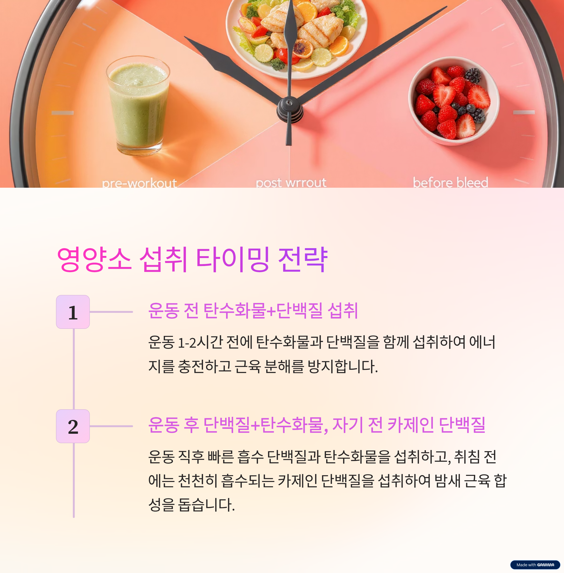 영양소를 언제 섭취하느냐도 운동 효과에 큰 차이를 만듭니다. 운동 전에는 소화가 잘 되는 탄수화물과 소량의 단백질을 섭취해 에너지를 준비하세요. 운동 중에는 수분과 전해질 보충이 핵심이며, 운동 직후에는 단백질과 탄수화물을 함께 섭취하는 것이 회복에 이상적입니다. 또한 자기 전에는 카제인 단백질처럼 흡수가 느린 단백질을 섭취하면 밤새 근육 회복을 돕습니다.