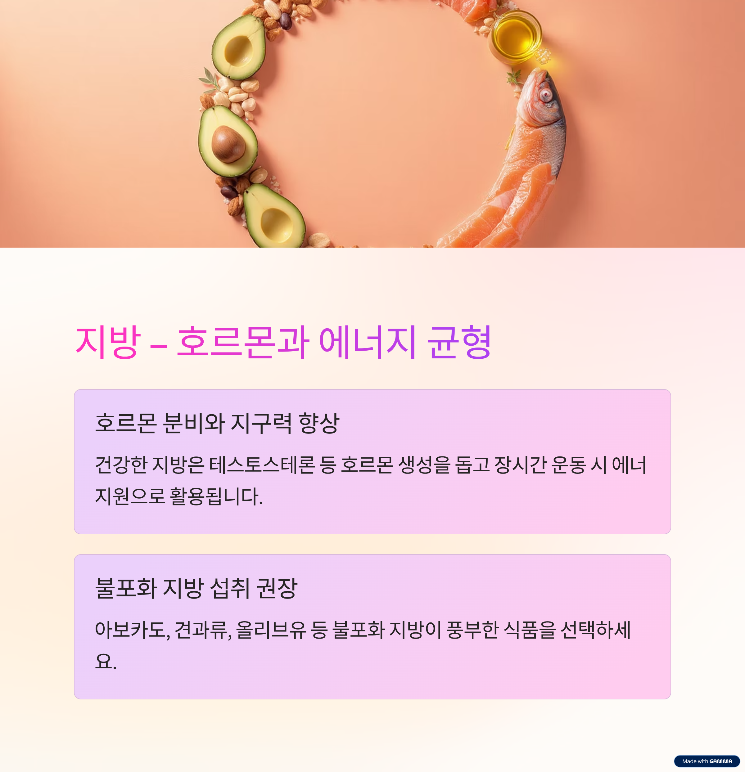 지방은 운동 시 지구력을 높이는 데 기여하며, 호르몬 분비에도 필수적입니다. 특히 테스토스테론과 성장 호르몬은 근육 발달과 밀접한 관련이 있습니다. 아보카도, 올리브유, 견과류, 연어 같은 불포화 지방은 건강한 에너지원으로 적절히 섭취해야 합니다. 지방을 과도하게 제한하면 호르몬 불균형으로 운동 성과가 떨어질 수 있습니다.