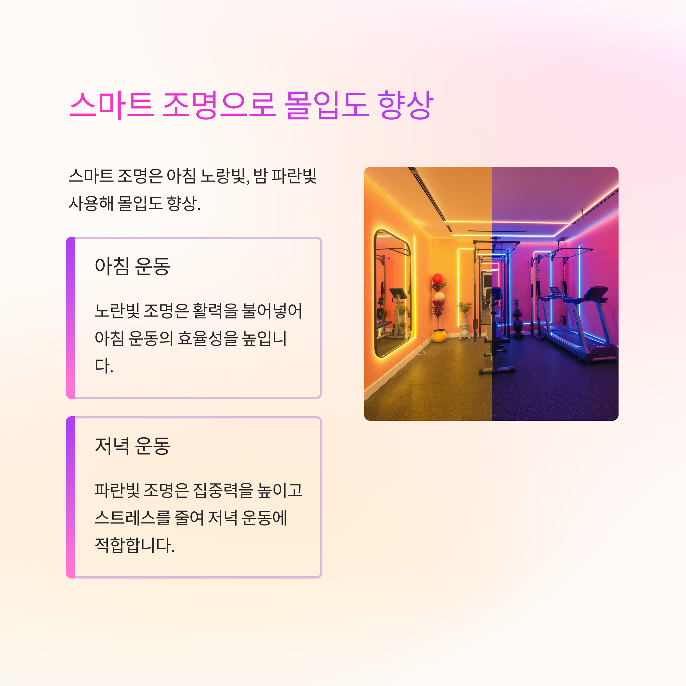스마트 조명은 운동 목적에 따라 색을 조절할 수 있습니다. 아침엔 노란빛으로 활력, 밤엔 파란빛으로 긴장 완화. 배경 음악과 함께 사용하면 몰입력이 상승합니다.