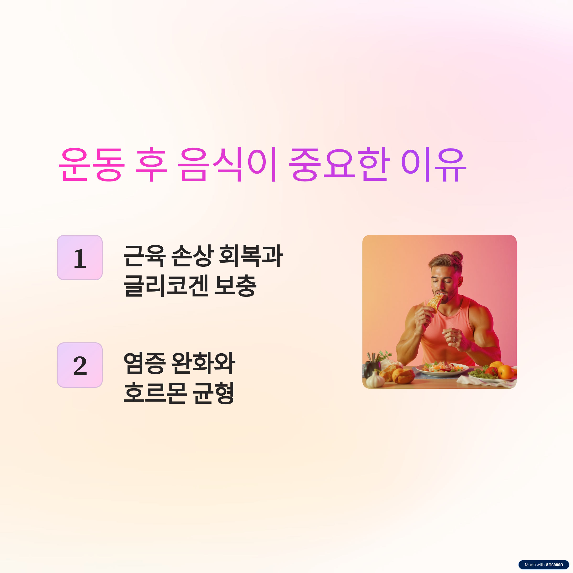 운동 후 피로한 근육을 빠르게 회복시키기 위해서는 올바른 음식 선택이 필수적입니다. 단순히 배고픔을 달래는 식사가 아니라, 근육의 회복과 성장에 필요한 영양소를 채워주는 것이 핵심입니다. 이번 글에서는 운동 후 근육 피로를 풀어주는 대표적인 음식 리스트와 함께, 효과적인 섭취 방법을 정리했습니다.