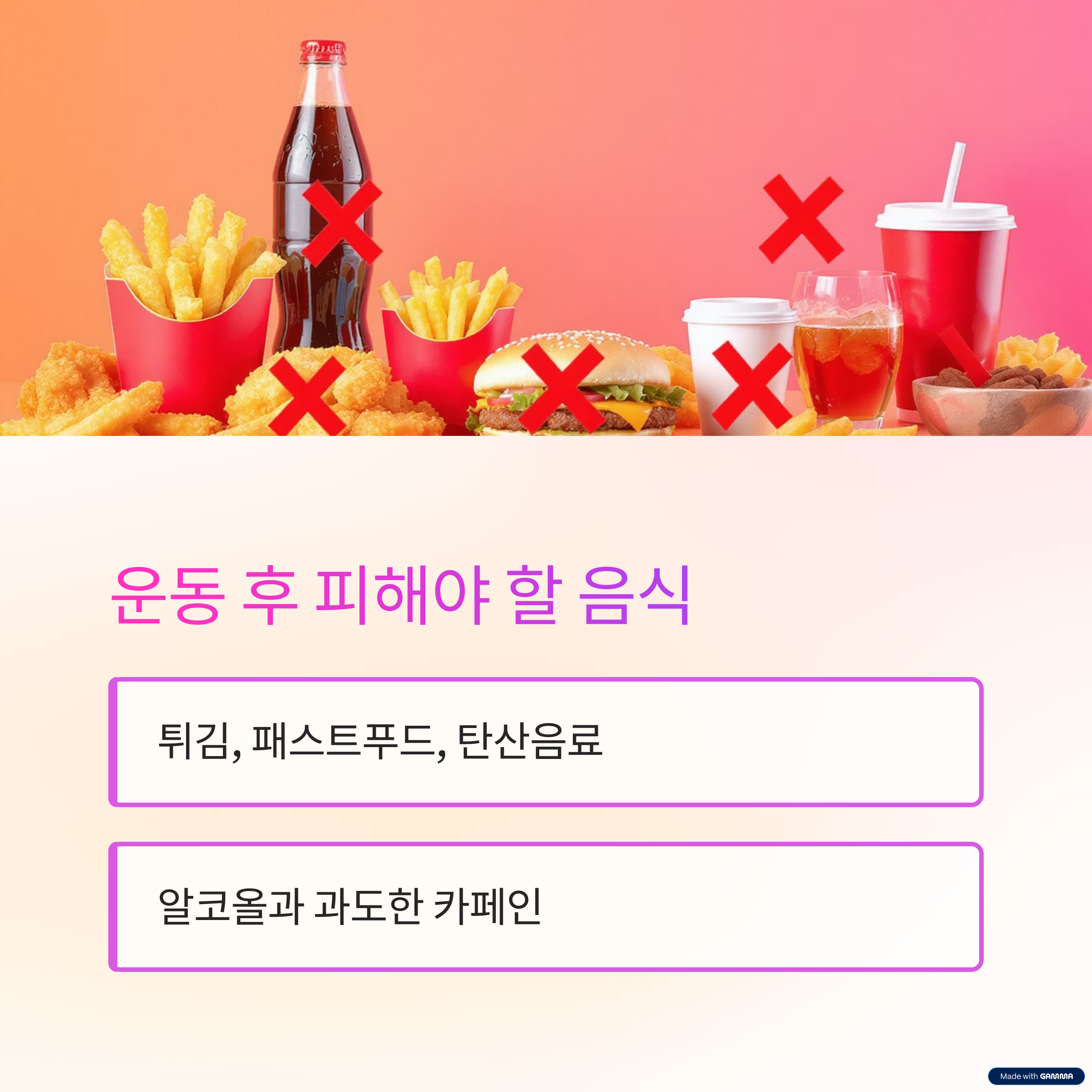 운동 직후에는 흡수가 느리고 기름진 음식은 피하는 것이 좋습니다. 패스트푸드, 튀김류, 과도한 카페인 음료, 탄산음료 등은 회복을 방해합니다. 또한 알코올은 단백질 합성을 방해하고 탈수를 유발하기 때문에 운동 후에는 삼가는 것이 좋습니다.