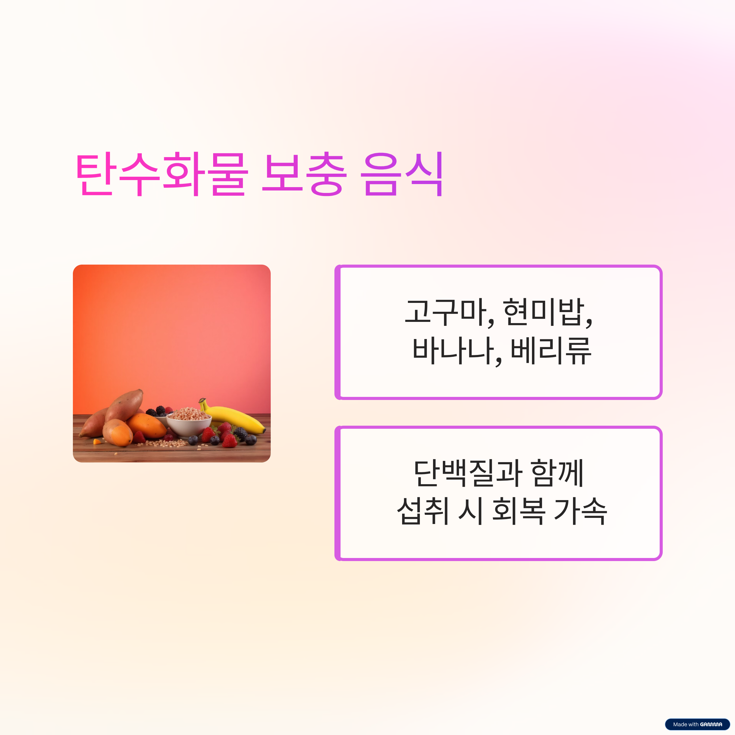 탄수화물은 고갈된 글리코겐을 빠르게 채우는 역할을 합니다. 고구마, 현미밥, 귀리, 바나나, 베리류 과일 등이 이상적인 선택입니다. 운동 후 단백질과 함께 섭취하면 근육 회복 속도가 훨씬 빨라집니다. 예를 들어 닭가슴살과 고구마, 그릭 요거트와 바나나 조합은 훌륭한 회복식입니다.
