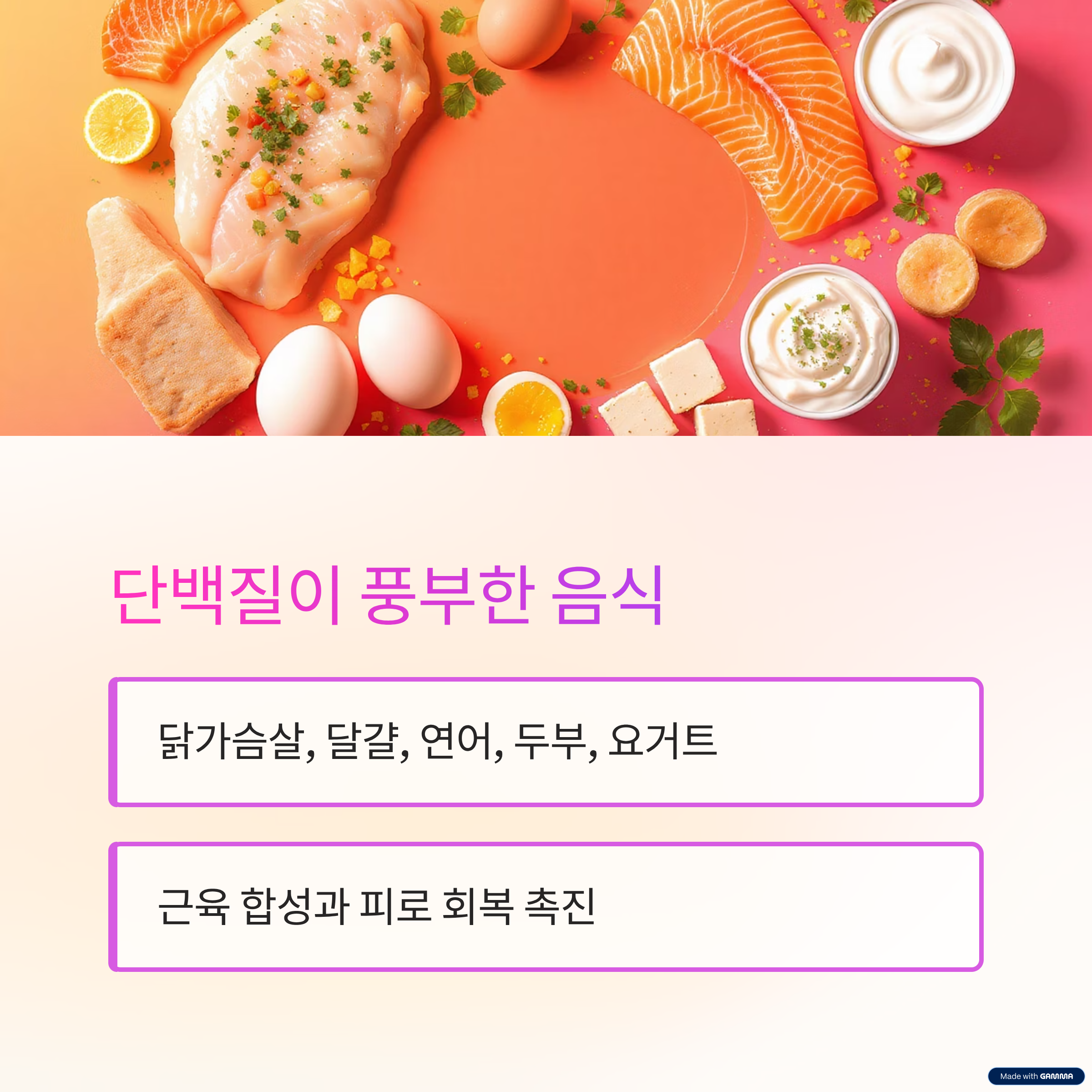 단백질은 손상된 근육을 복구하고 새로운 근육 합성을 촉진합니다. 대표적으로 닭가슴살, 달걀, 연어, 두부, 그릭 요거트, 콩류 등이 있습니다. 특히 단백질과 아미노산이 풍부한 음식을 섭취하면 근육 피로 회복에 효과적입니다. 운동 후에는 흡수가 빠른 단백질 파우더를 활용해도 좋습니다.