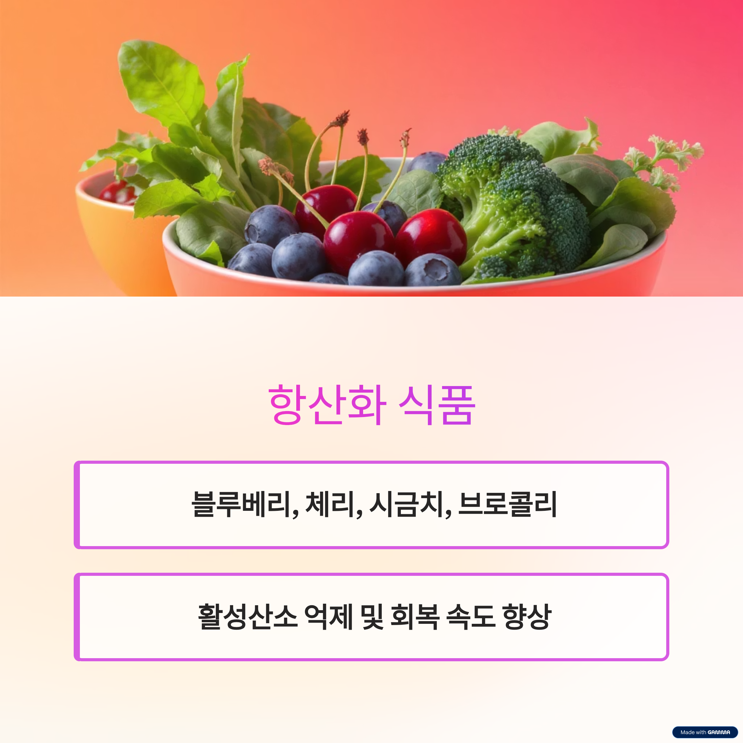 운동 후에는 활성산소가 증가해 근육 손상과 피로가 심해질 수 있습니다. 블루베리, 체리, 석류, 시금치, 브로콜리 같은 항산화 식품은 염증을 완화하고 회복 속도를 높여줍니다. 특히 베리류는 운동 후 먹기에 간편하면서도 항산화 효과가 뛰어나 많은 운동선수들이 즐겨 찾습니다.
