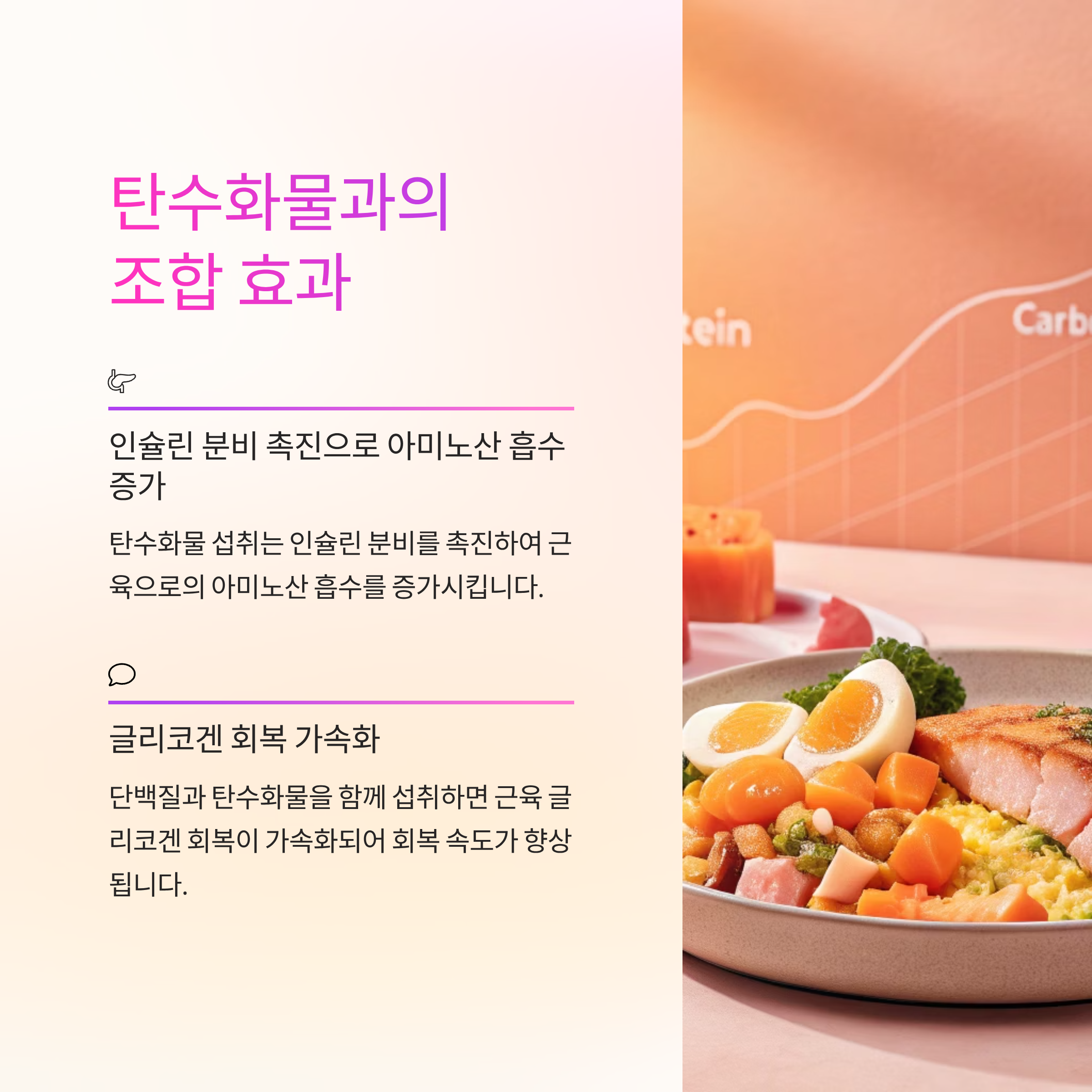 운동 후에는 단백질만큼이나 탄수화물도 중요합니다. 탄수화물을 함께 섭취하면 인슐린 분비가 촉진되어 아미노산의 근육 내 흡수가 원활해지고, 글리코겐 회복 속도도 빨라집니다. 따라서 초콜릿 우유, 닭가슴살 샌드위치, 과일과 단백질 쉐이크 같은 탄수화물+단백질 조합이 가장 효과적인 회복 식사로 꼽힙니다.