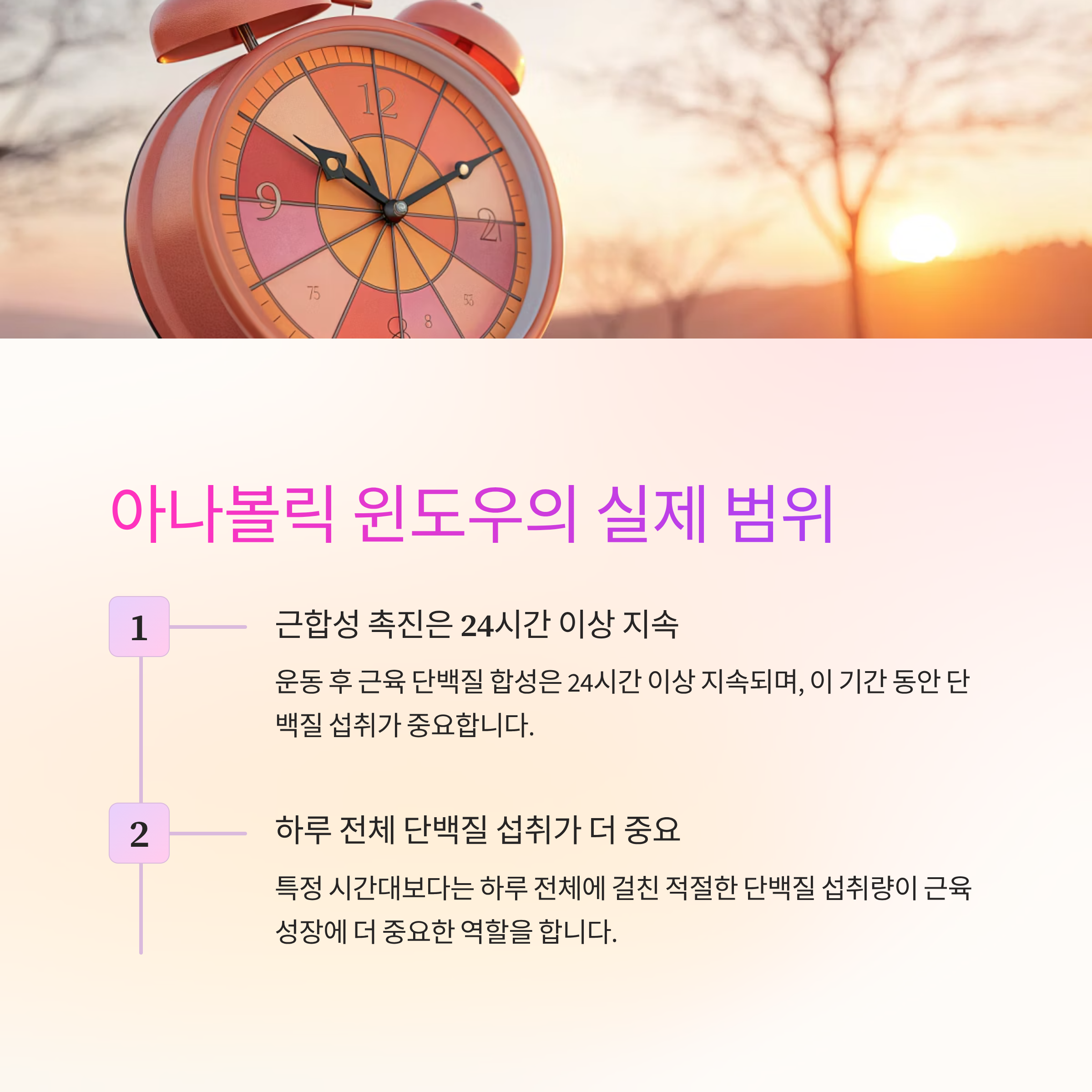운동 직후 근육은 민감한 상태가 되어 영양소를 잘 받아들이는 ‘동화 작용(아나볼릭)’이 촉진됩니다. 이때 단백질과 아미노산을 섭취하면 근육 합성이 빠르게 일어나지만, 그렇다고 30분이라는 짧은 시간 안에만 효과가 발생하는 것은 아닙니다. 최근 연구에서는 운동 후 몇 시간 동안 근단백질 합성이 높아진 상태가 지속된다는 사실이 밝혀졌습니다.
