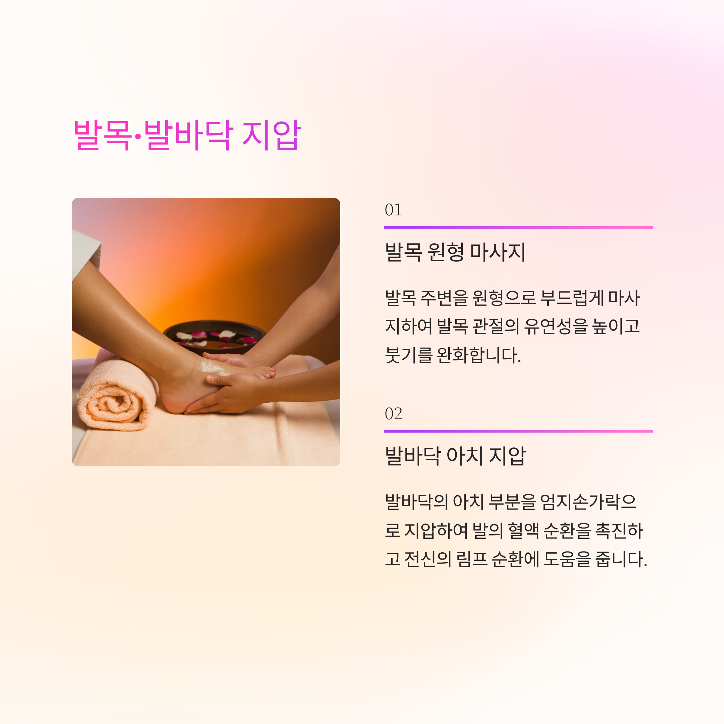 발목과 발바닥은 림프 순환의 말단입니다. 이 부위를 자극하면 하체 붓기 완화에 빠른 효과를 줍니다.