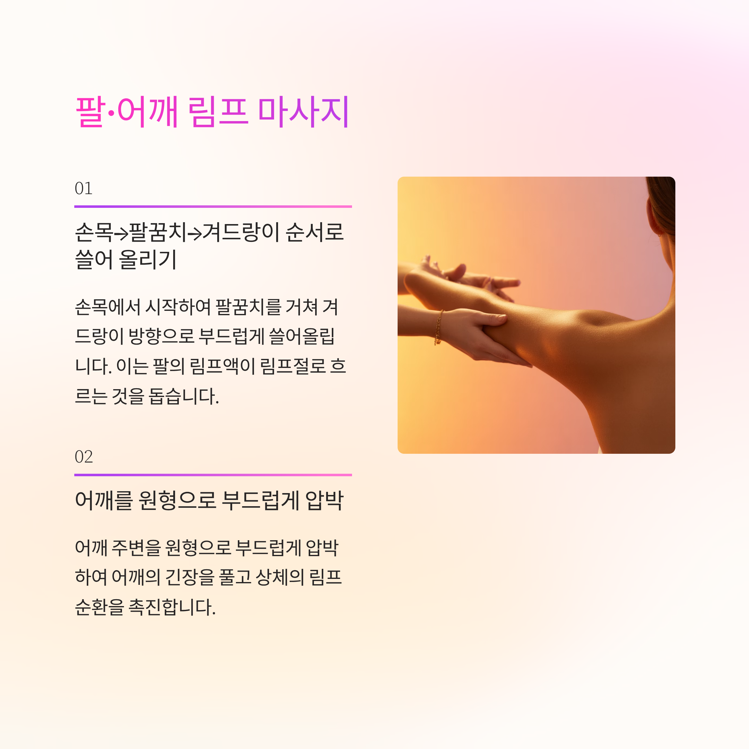 - 손목에서 팔꿈치 방향으로, 팔꿈치에서 겨드랑이 방향으로 쓸어 올리기