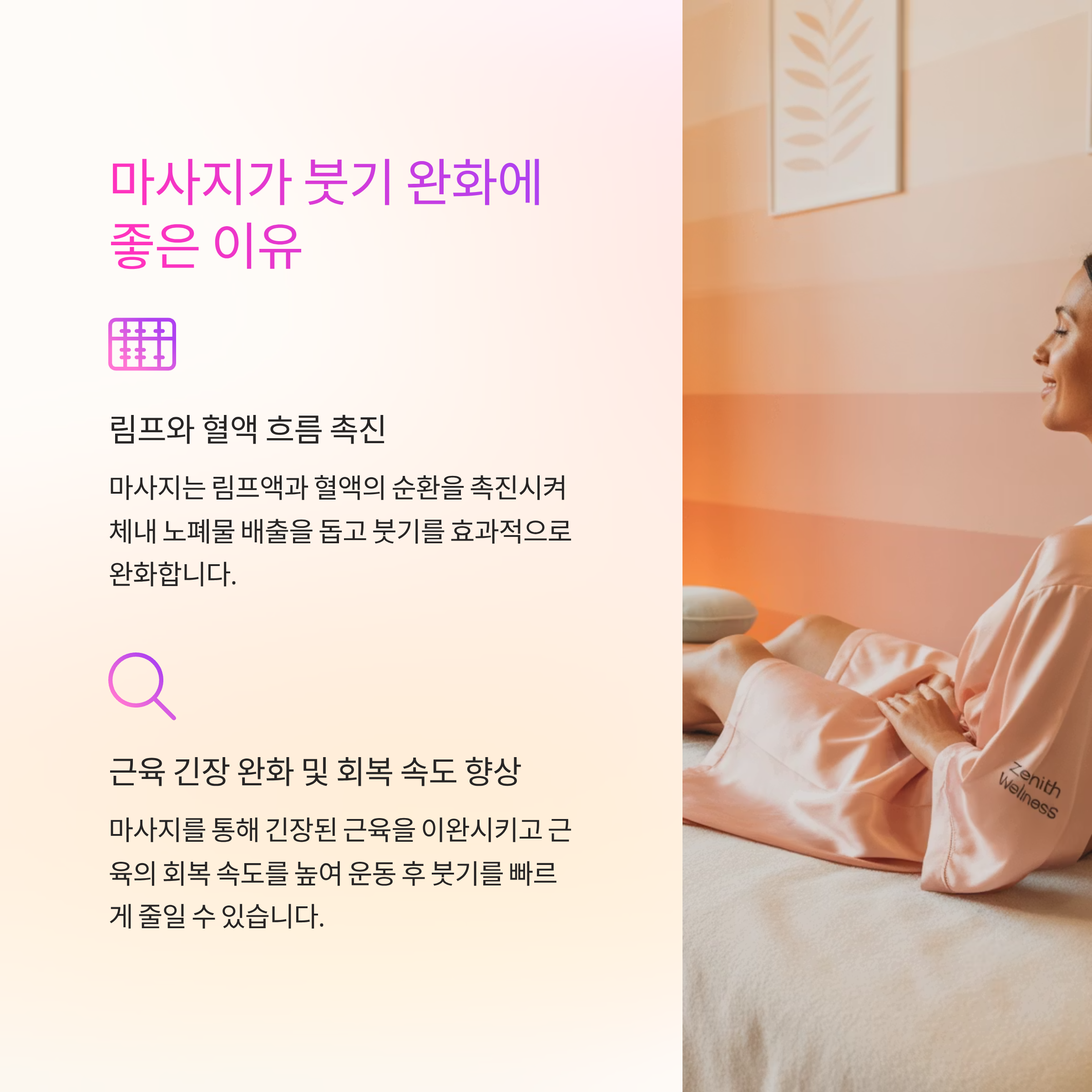 마사지는 정체된 림프액과 혈액의 흐름을 촉진해 붓기를 줄여줍니다. 또한 근육 속 노폐물 배출을 도와 회복을 빠르게 합니다.