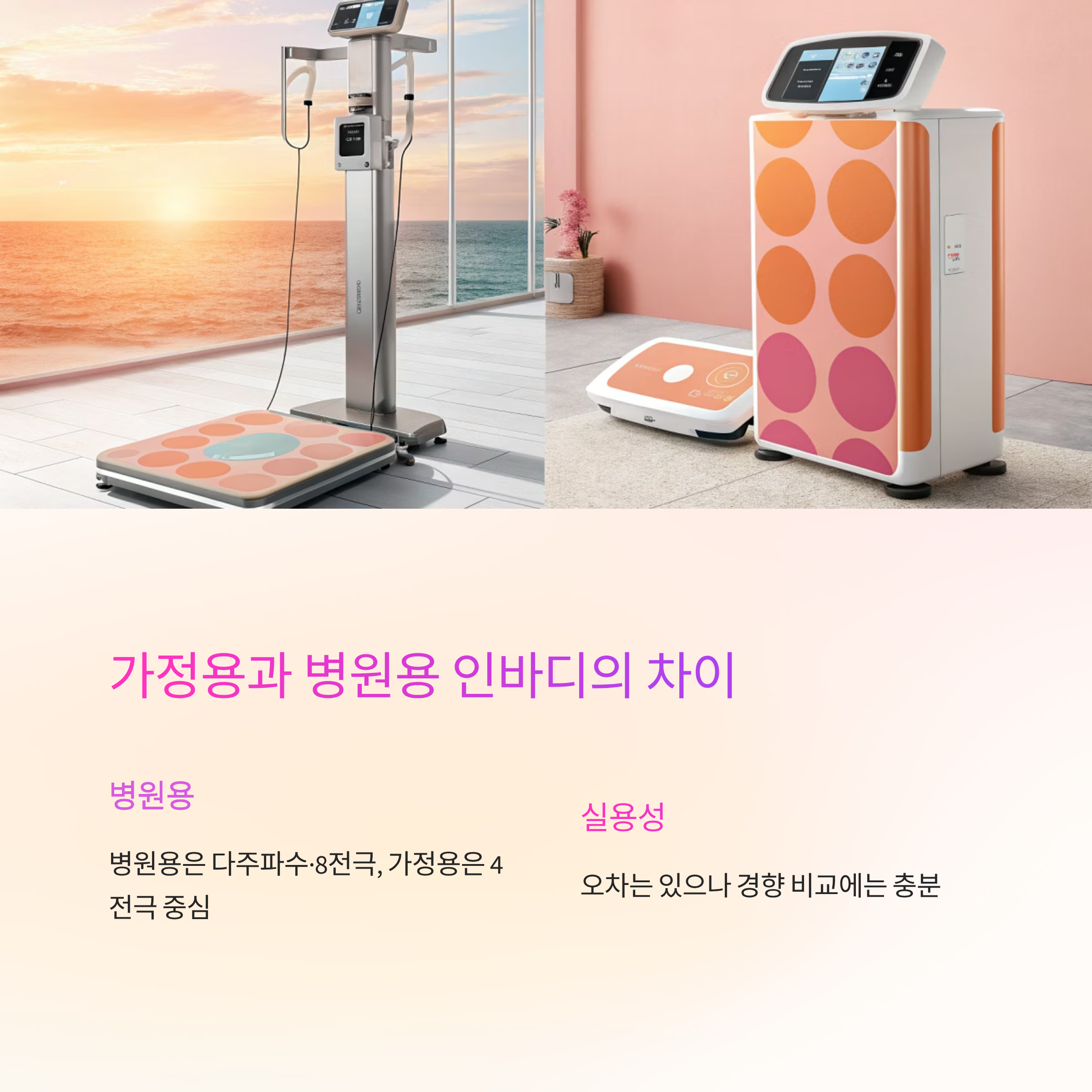 가정용 인바디는 병원용 모델에 비해 측정 주파수나 전극 수가 다소 적지만, 경향 파악과 자가 모니터링에는 충분히 효과적입니다.