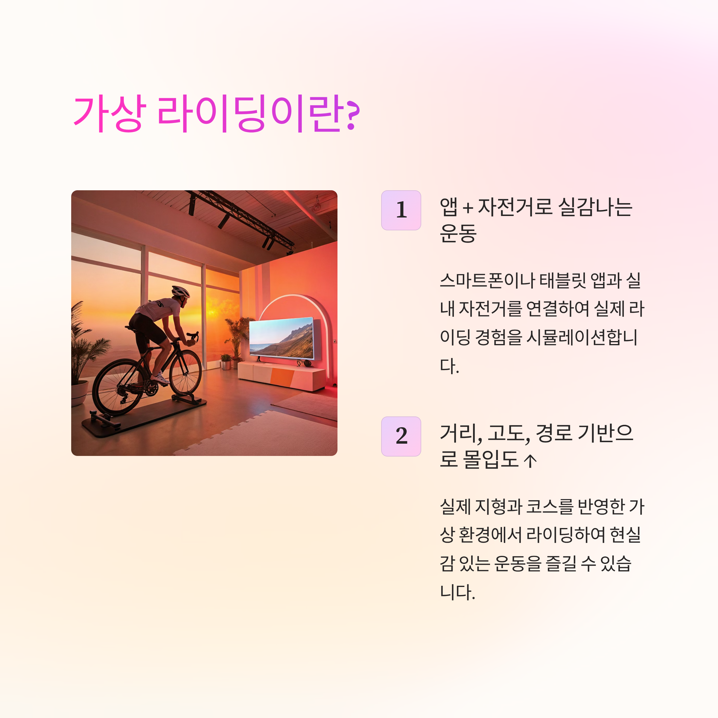 가상 라이딩은 실내 자전거 + 디지털 앱을 활용해, 현실처럼 코스를 달리고 목표를 설정하며 운동하는 방식입니다.