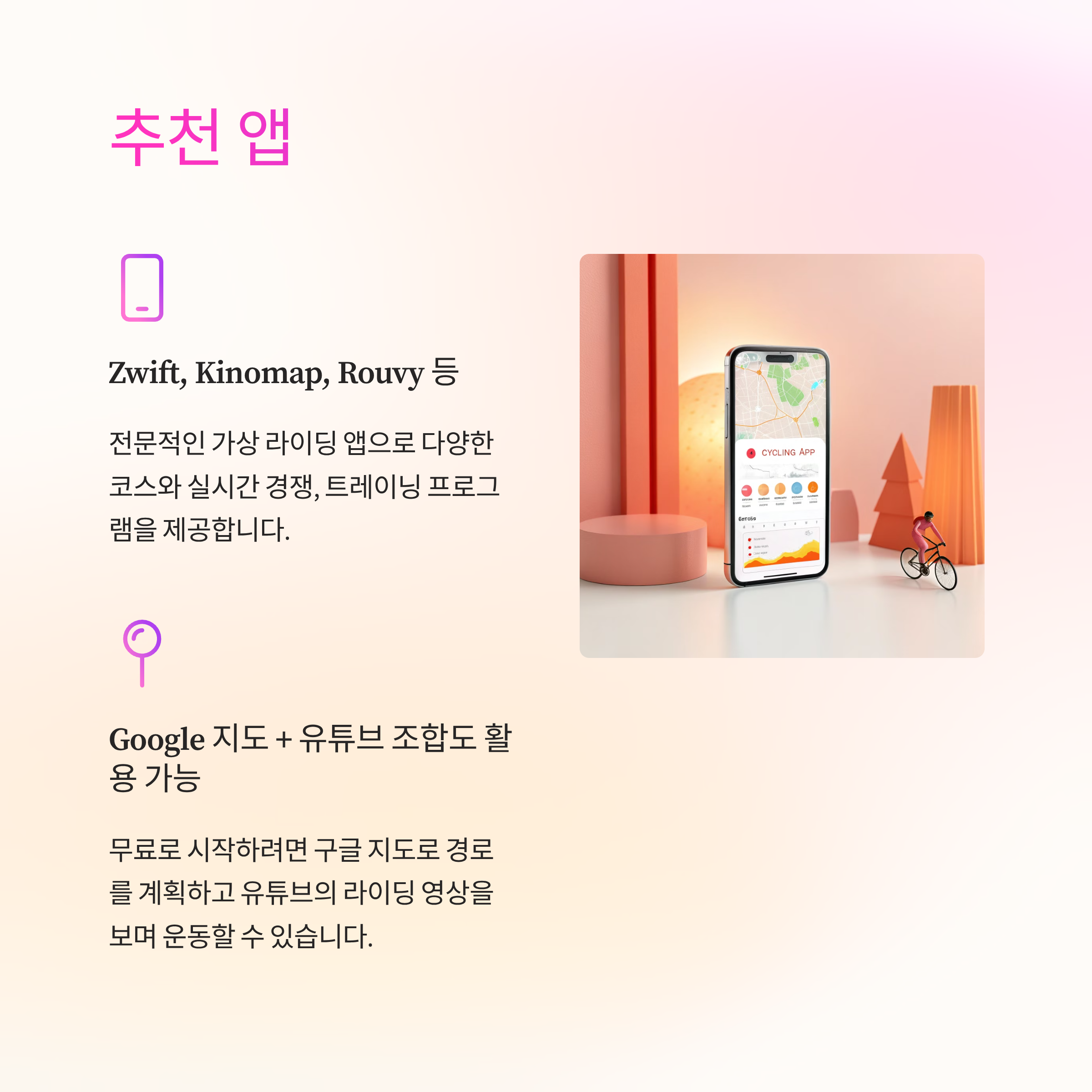 최근엔 앱 연동과 가상 콘텐츠 덕분에 더 실감 나는 라이딩이 가능해졌습니다.