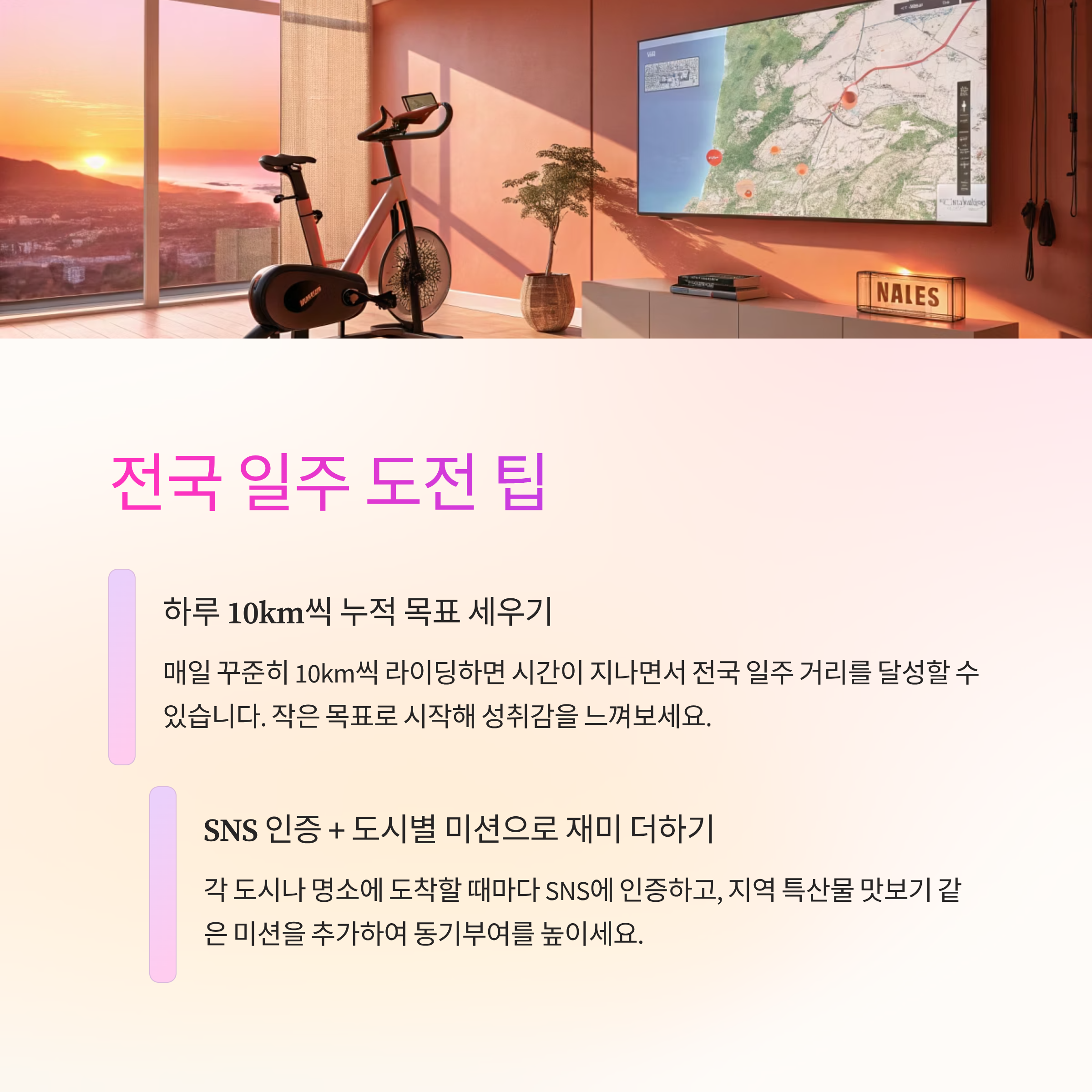 자취방에서도 전국을 달릴 수 있는 시대! 실내 자전거와 앱을 활용하면, 단순한 운동을 즐거운 여행 프로젝트로 바꿀 수 있습니다. 오늘부터 나만의 가상 라이딩 전국 일주에 도전해 보세요.