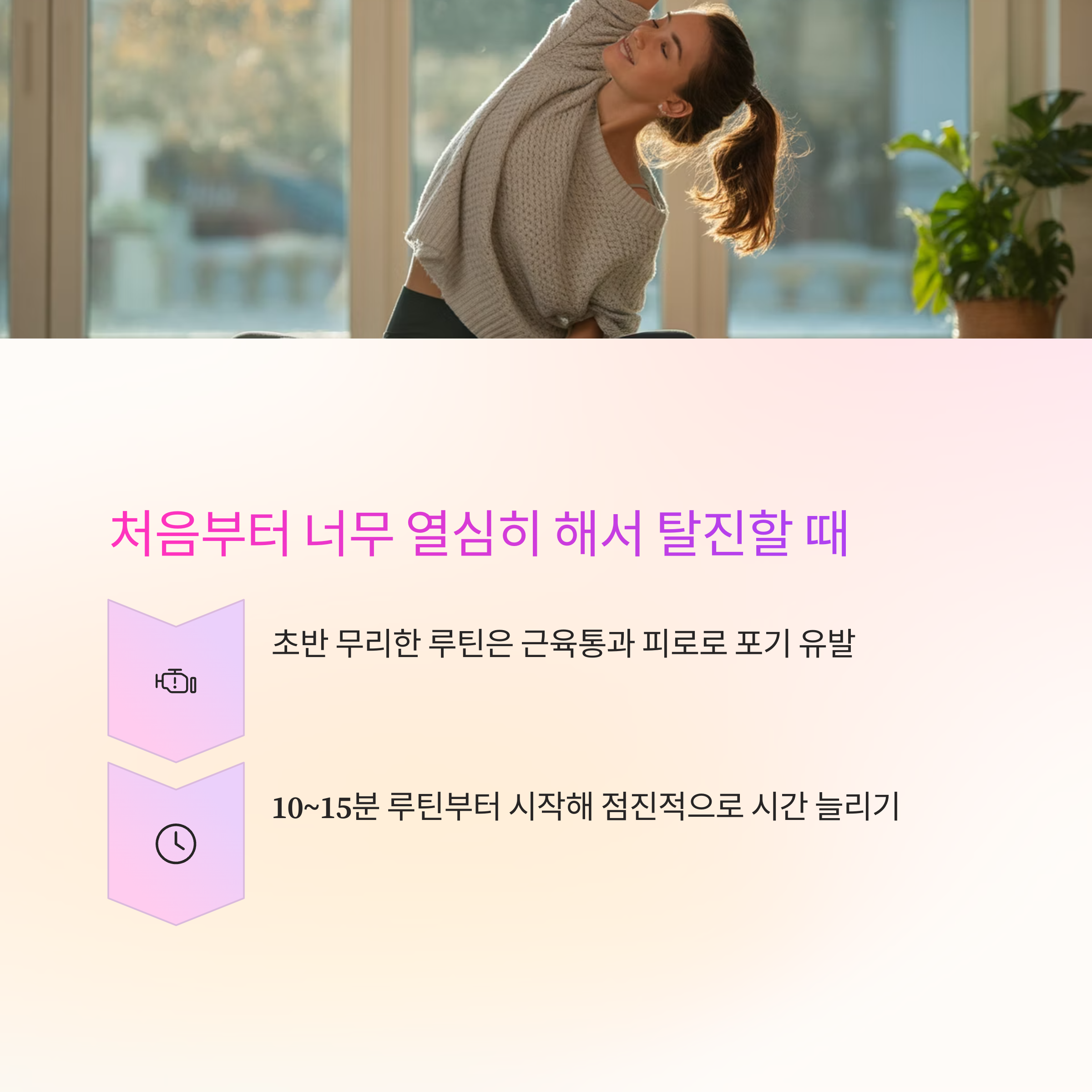 운동을 안 하던 사람이 갑자기 1시간 고강도 루틴을 시작하면 근육통과 피로로 지속이 어렵습니다.