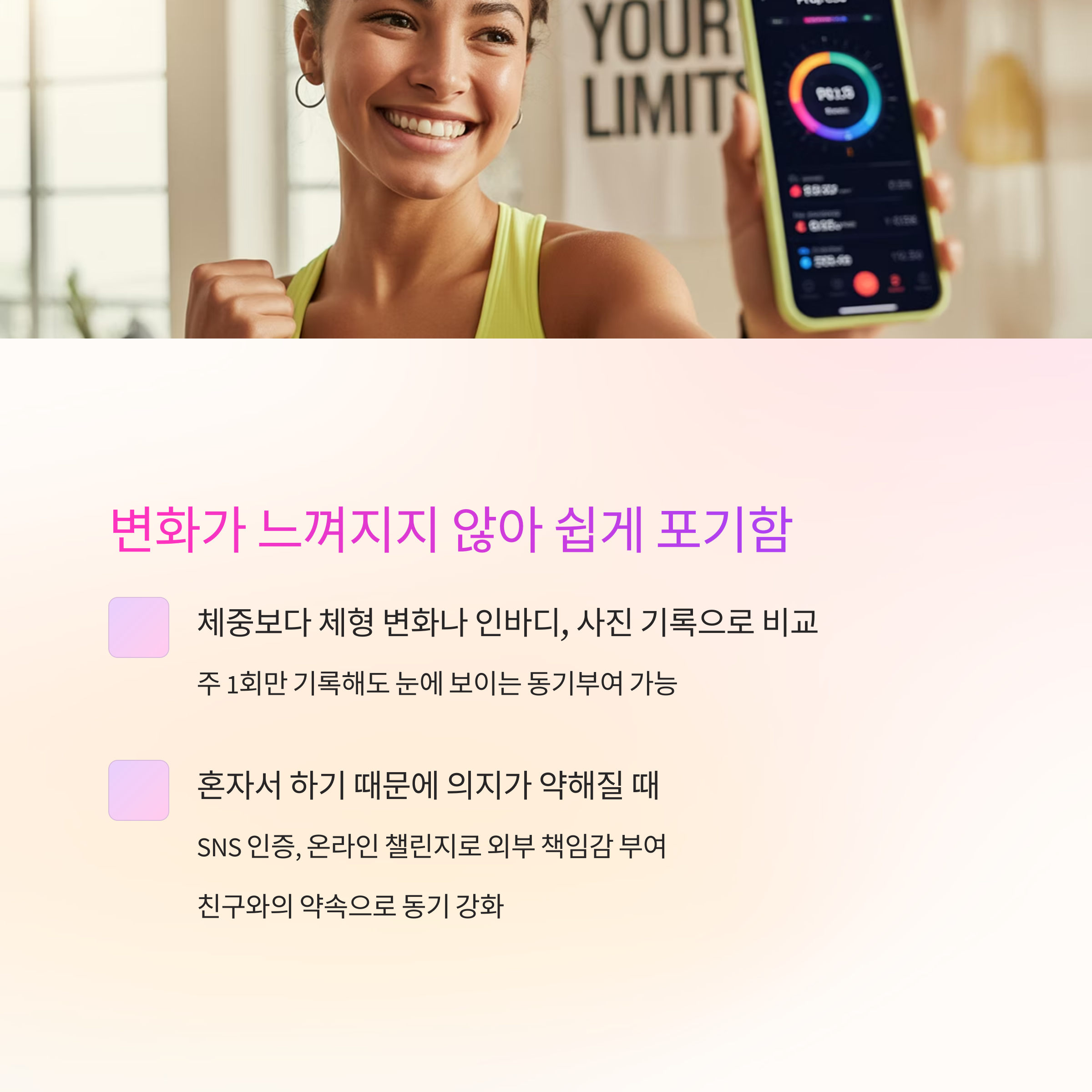 예: “8월까지 체지방 3kg 감량”처럼 수치화된 목표로 전환하세요.