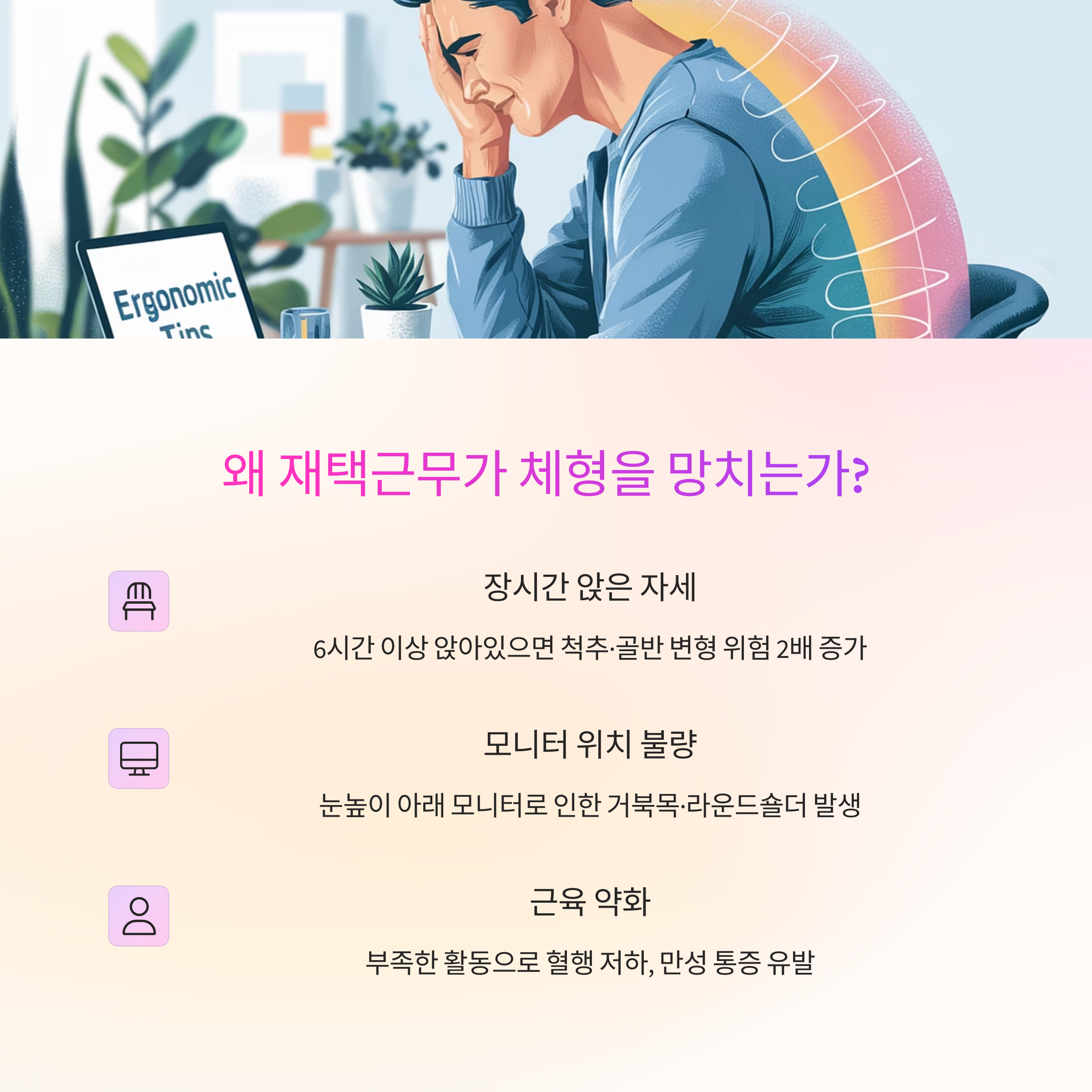 하루 8시간 이상 구부정한 자세를 유지하면, 작은 변화가 쌓여 심각한 체형 불균형을 초래합니다.