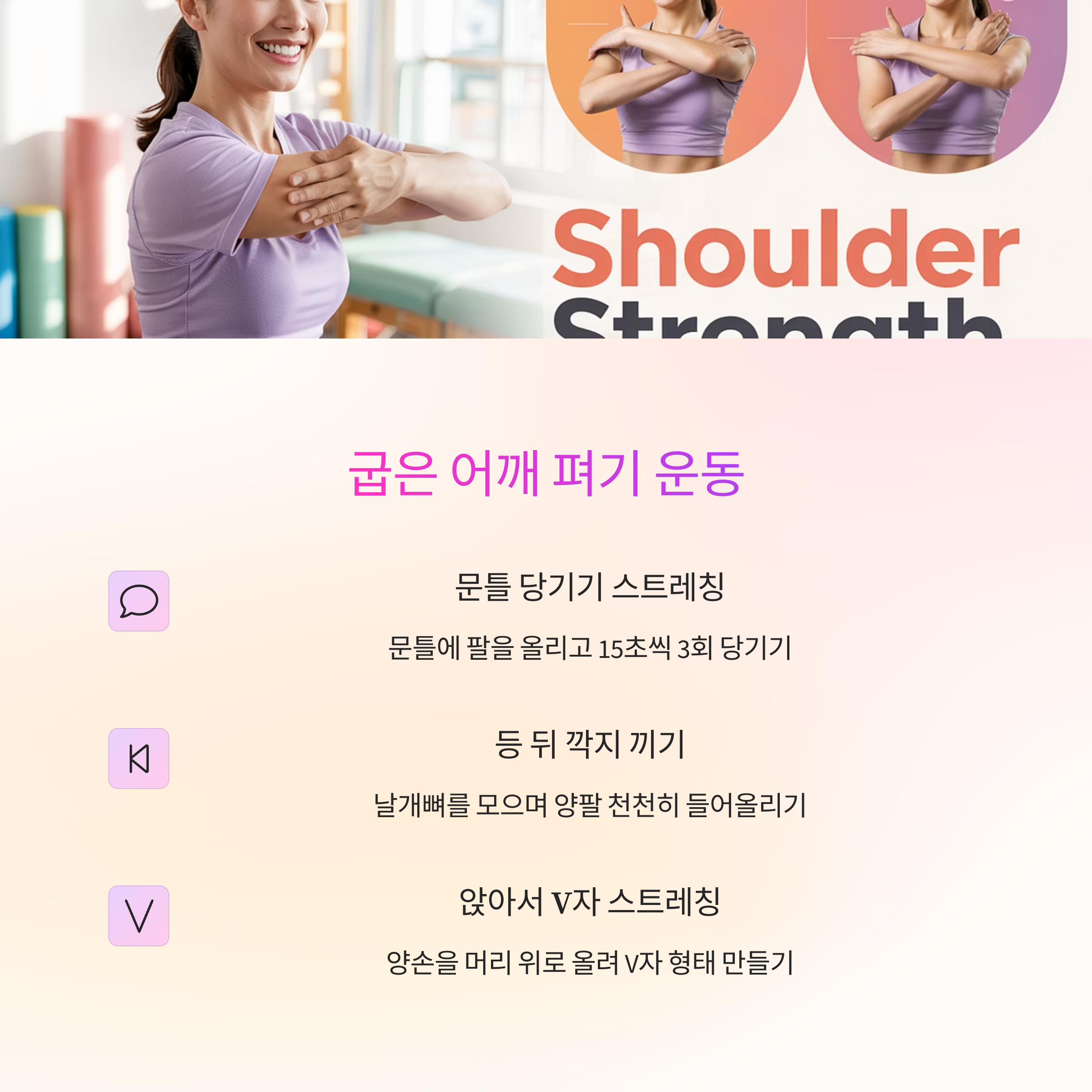 굽은 어깨를 펴는 가장 간단한 방법은 가슴을 열어주는 스트레칭입니다.