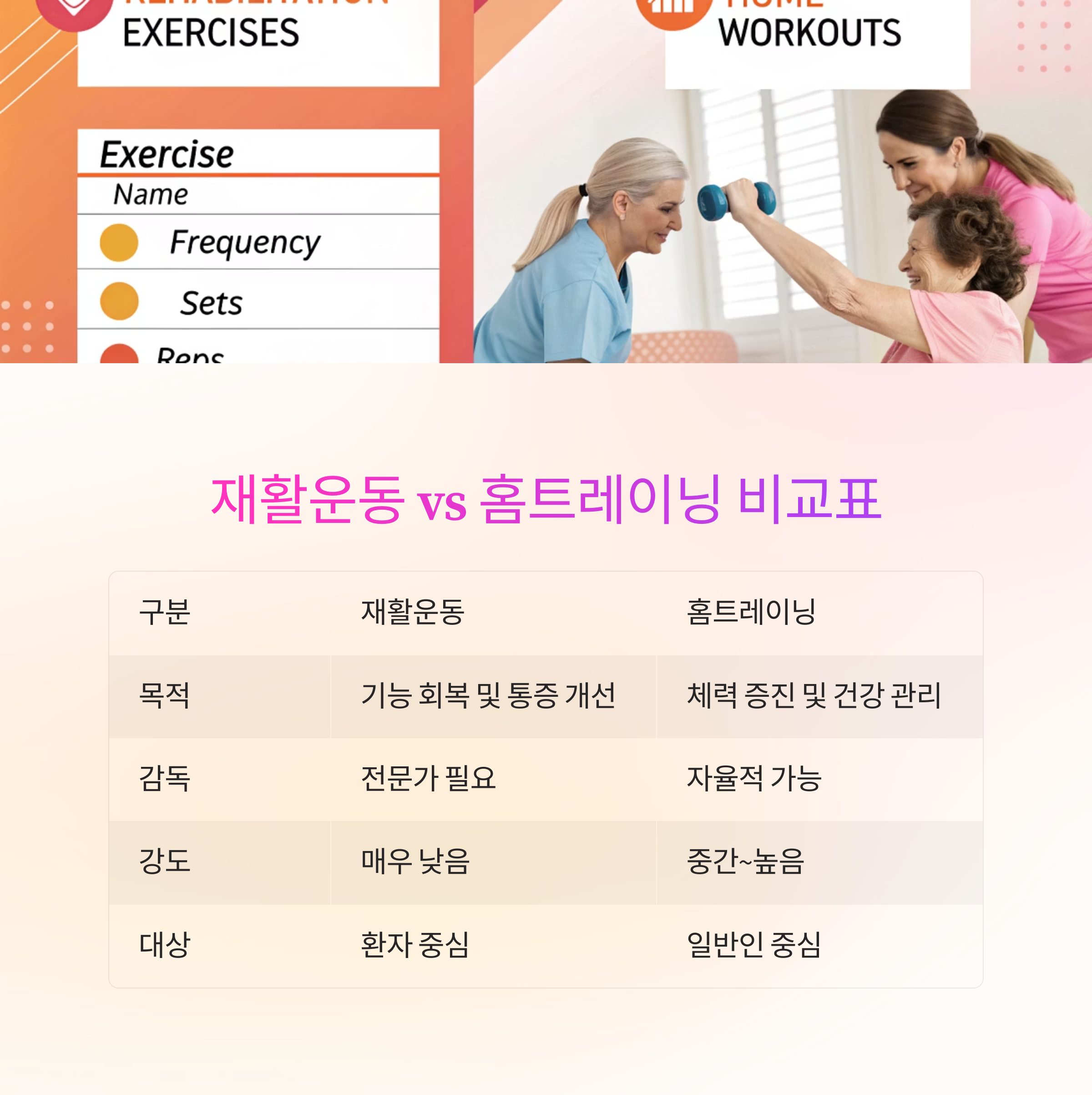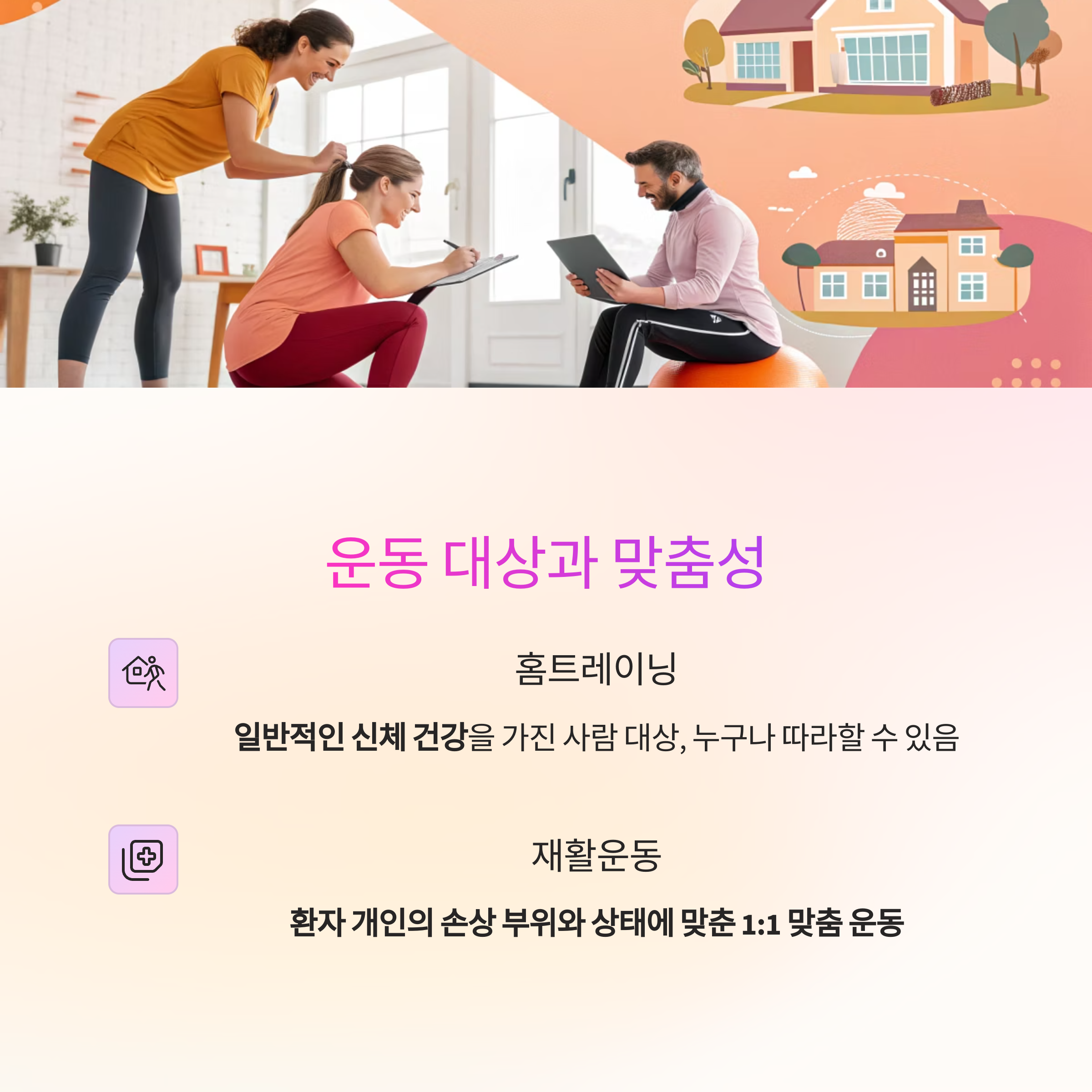 이 글에서는 재활운동과 홈트의 본질적인 차이점을 7가지 핵심 포인트로 정리하여 알려드립니다.