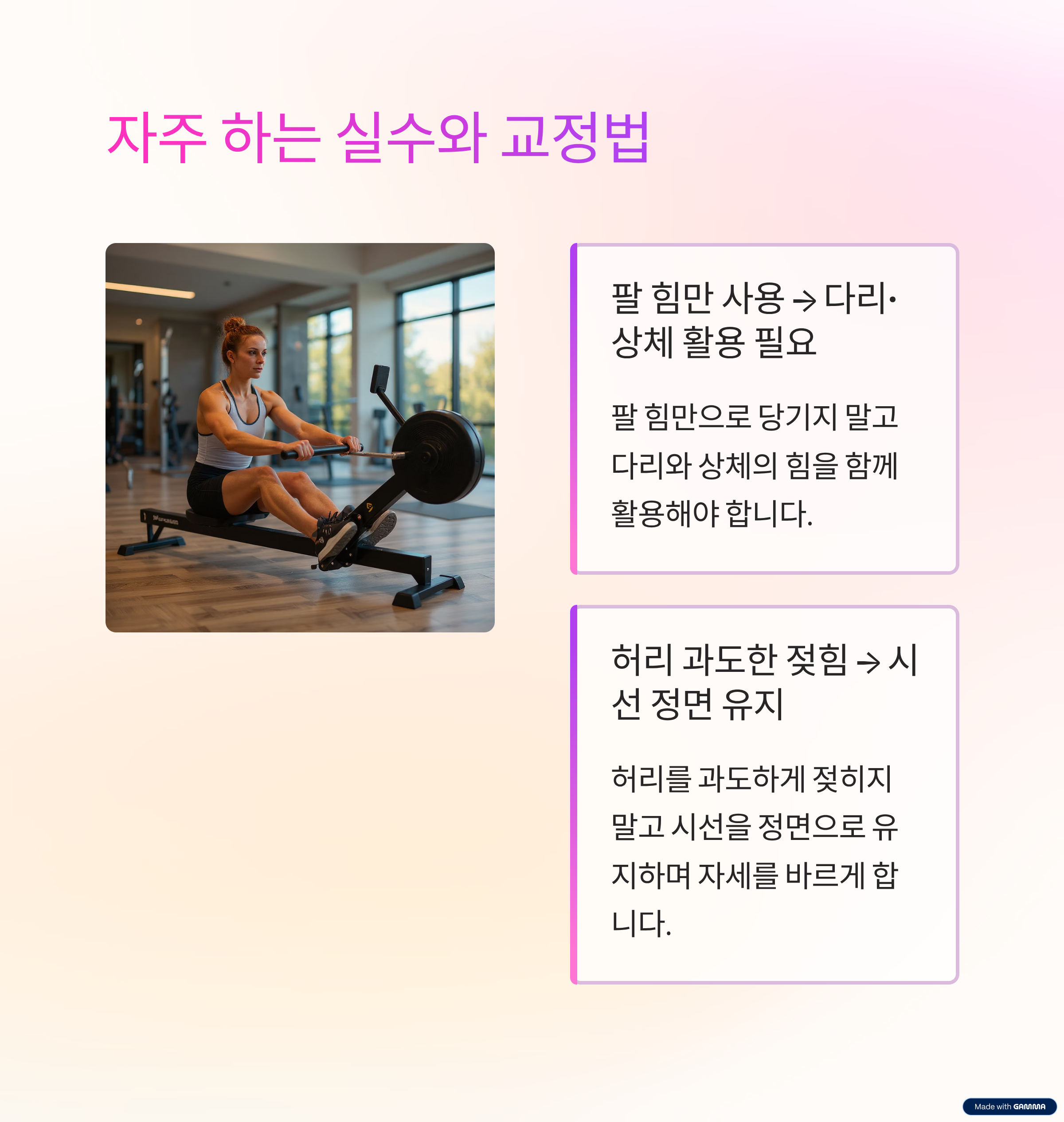 많은 사람들이 팔 힘에만 의존하거나 허리를 과도하게 젖히는 실수를 합니다. 이 경우 허리에 부담이 커지고 운동 효과가 떨어집니다. 교정법은 다리-상체-팔 순서로 당기고, 돌아올 때는 반대 순서를 지키는 것입니다. 또한 어깨에 긴장을 빼고, 시선은 정면을 유지해야 올바른 자세가 됩니다.