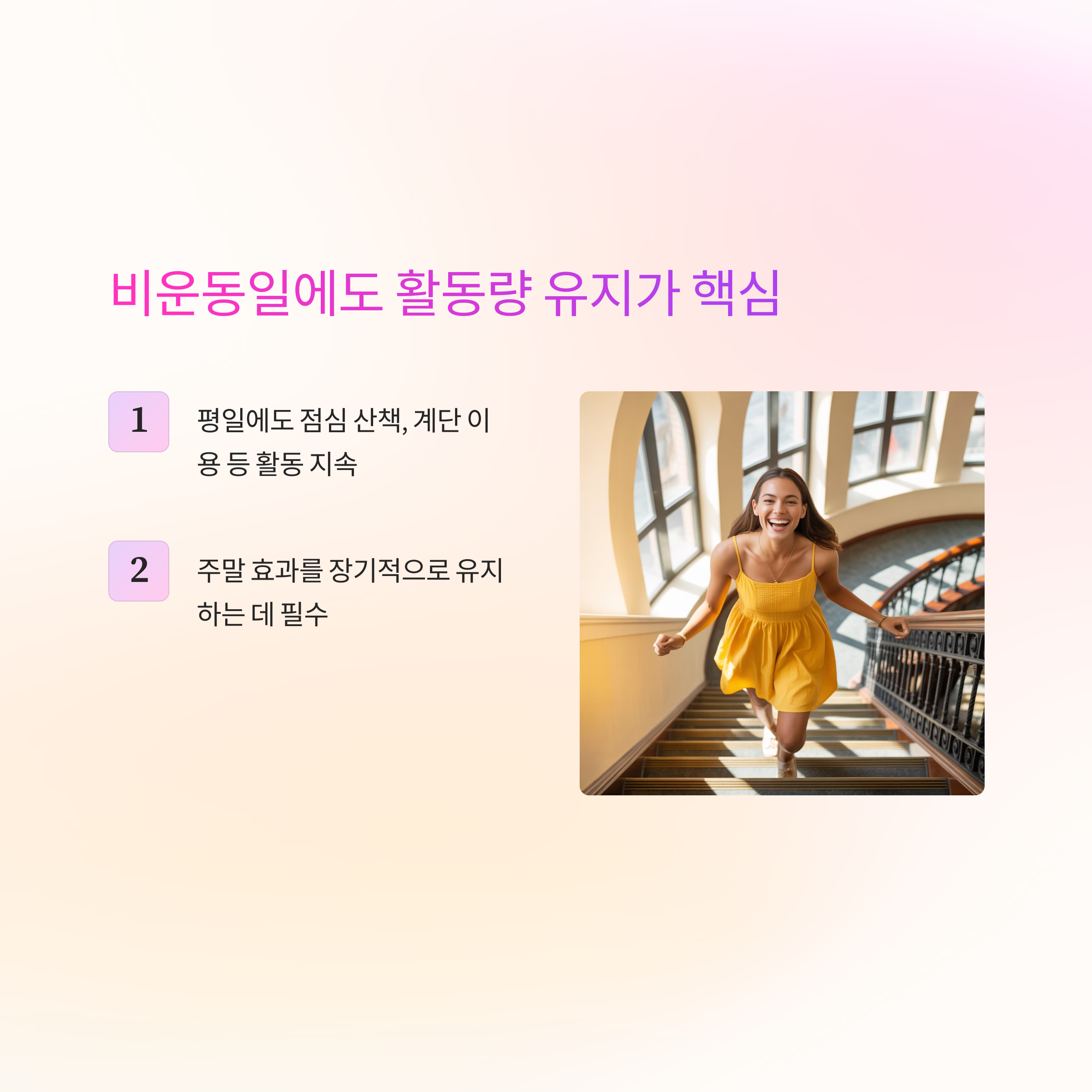 생활 속 작은 움직임을 평일에도 꾸준히 유지하면 지속성과 건강 두 마리 토끼를 잡을 수 있습니다.