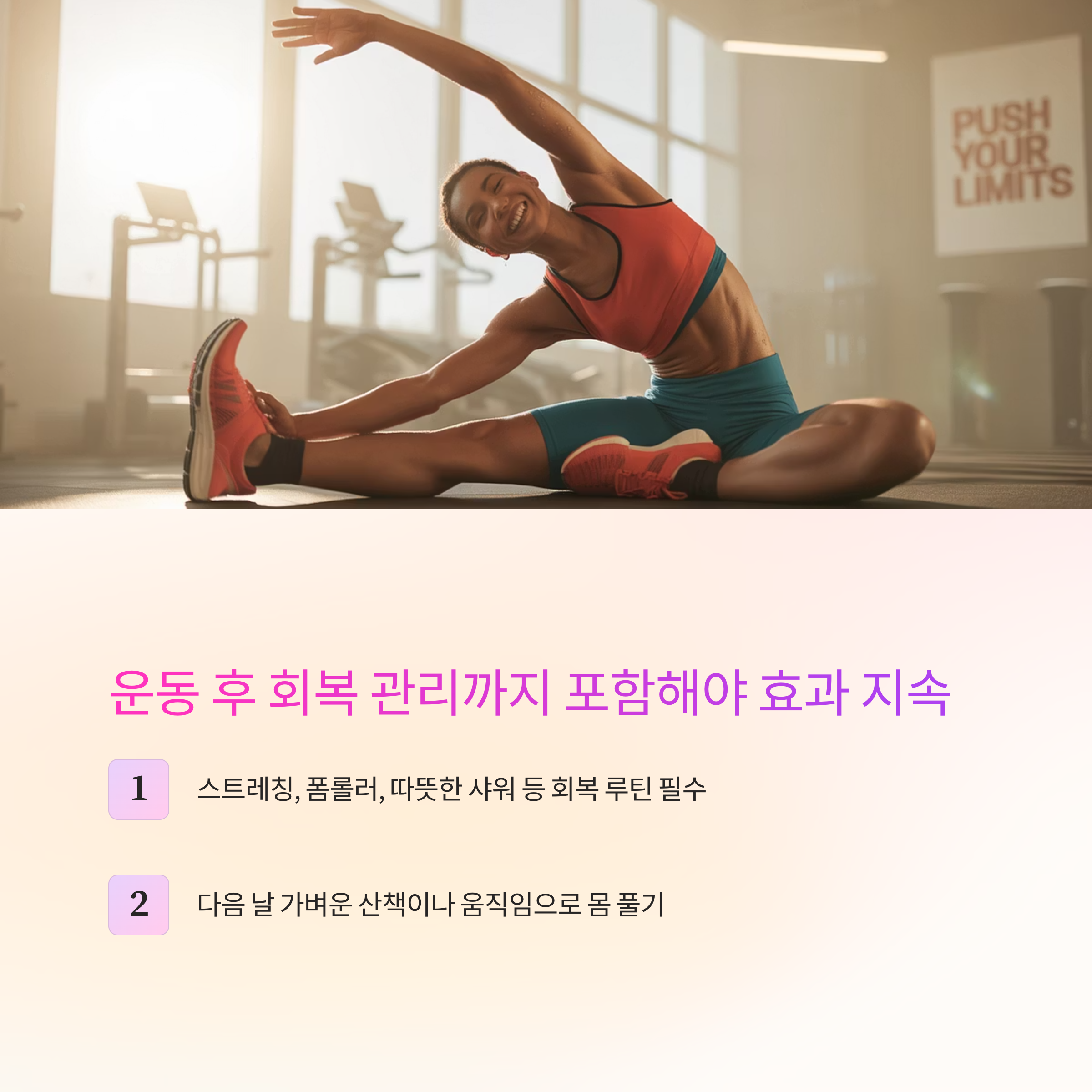운동 후에는 반드시 10분 이상 전신 스트레칭, 폼롤러 마사지, 따뜻한 물 샤워로 회복을 도와주세요.