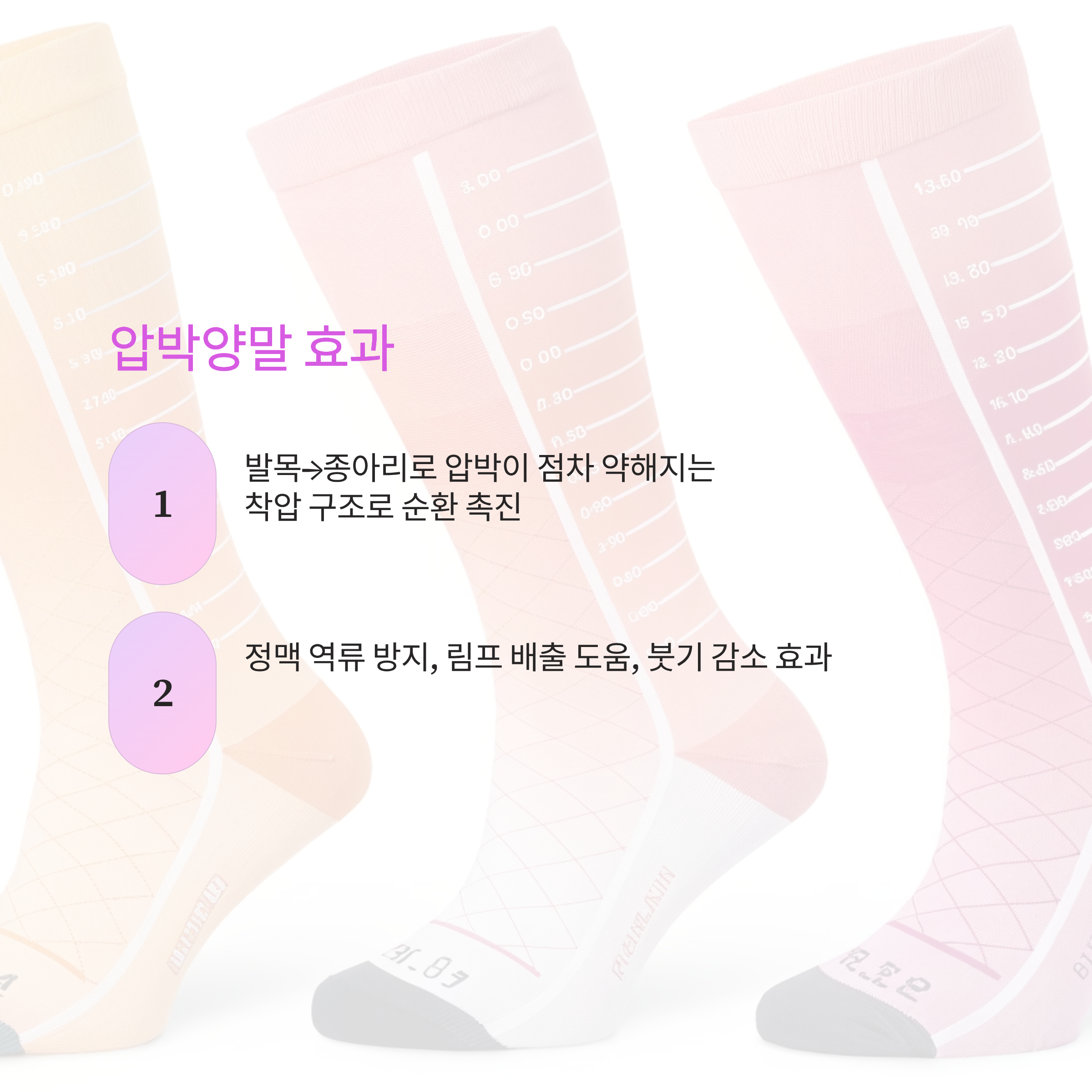 압박양말은 단순히 꽉 조이는 양말이 아닙니다. “의학적으로 설계된 착압(Graduated Compression)” 원리를 이용해 혈액을 위쪽으로 이동시키는 역할을 합니다.