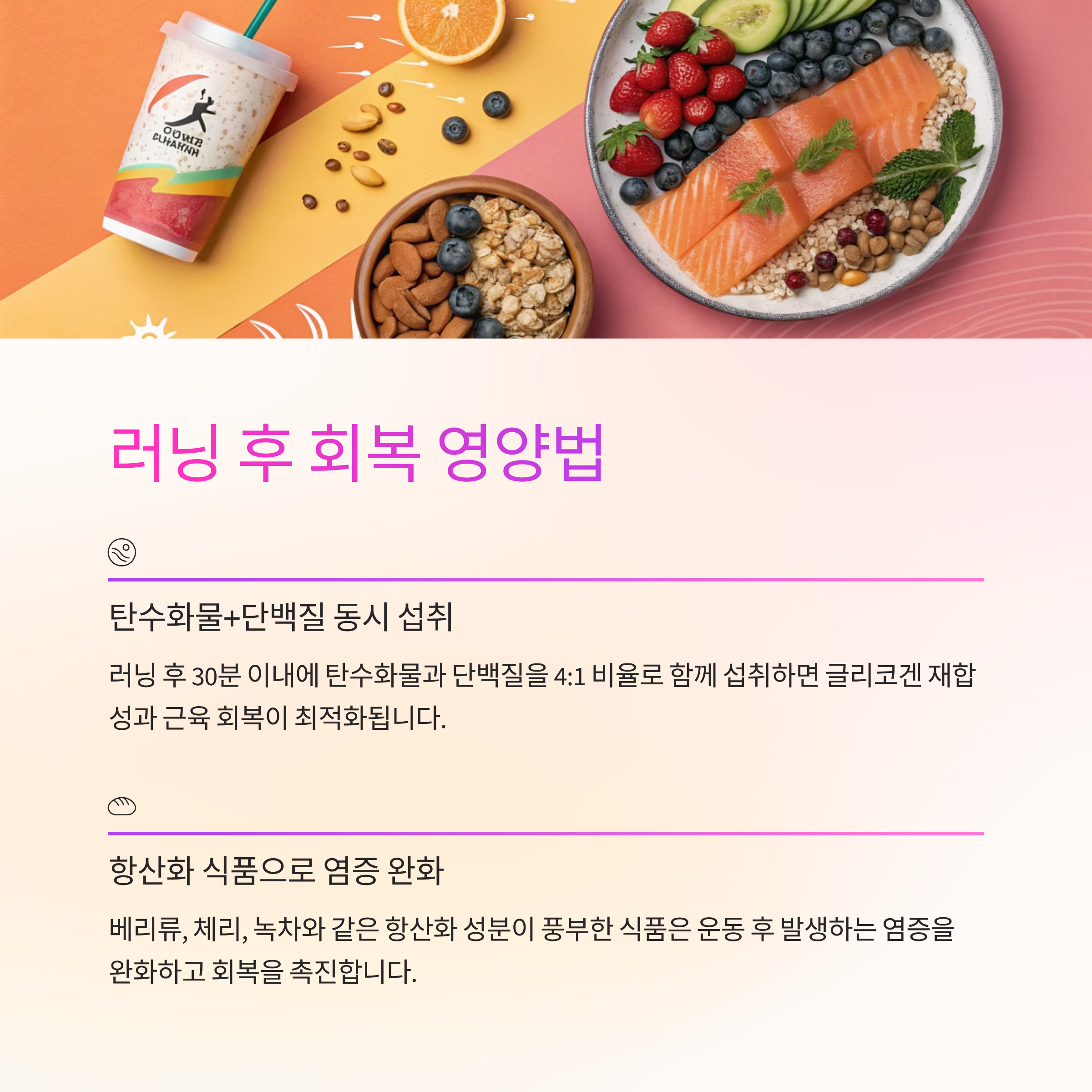 러닝이 끝나면 고갈된 글리코겐을 빠르게 채워야 합니다. 러닝 후 30분 이내에 탄수화물+단백질을 함께 섭취하는 것이 가장 효과적입니다. 예를 들어 초콜릿 우유, 바나나와 단백질 쉐이크, 닭가슴살 샌드위치 등이 회복에 도움이 됩니다. 또한 항산화 성분이 풍부한 베리류, 체리, 녹황색 채소를 함께 먹으면 근육 염증과 피로 회복에 유익합니다.