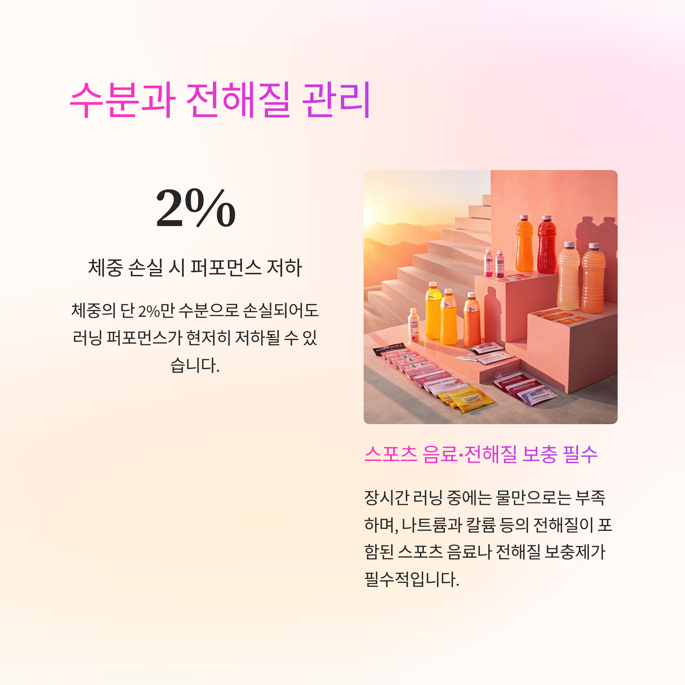 러닝 중 수분 손실은 체중의 2%만 되어도 퍼포먼스가 크게 떨어집니다. 따라서 정기적으로 물이나 스포츠 음료를 섭취해 탈수를 예방해야 합니다. 특히 땀으로 배출되는 나트륨, 칼륨, 마그네슘 같은 전해질도 보충해야 합니다. 전해질 보충제, 스포츠 음료, 소금 캡슐 등을 활용하면 근육 경련을 예방할 수 있습니다.