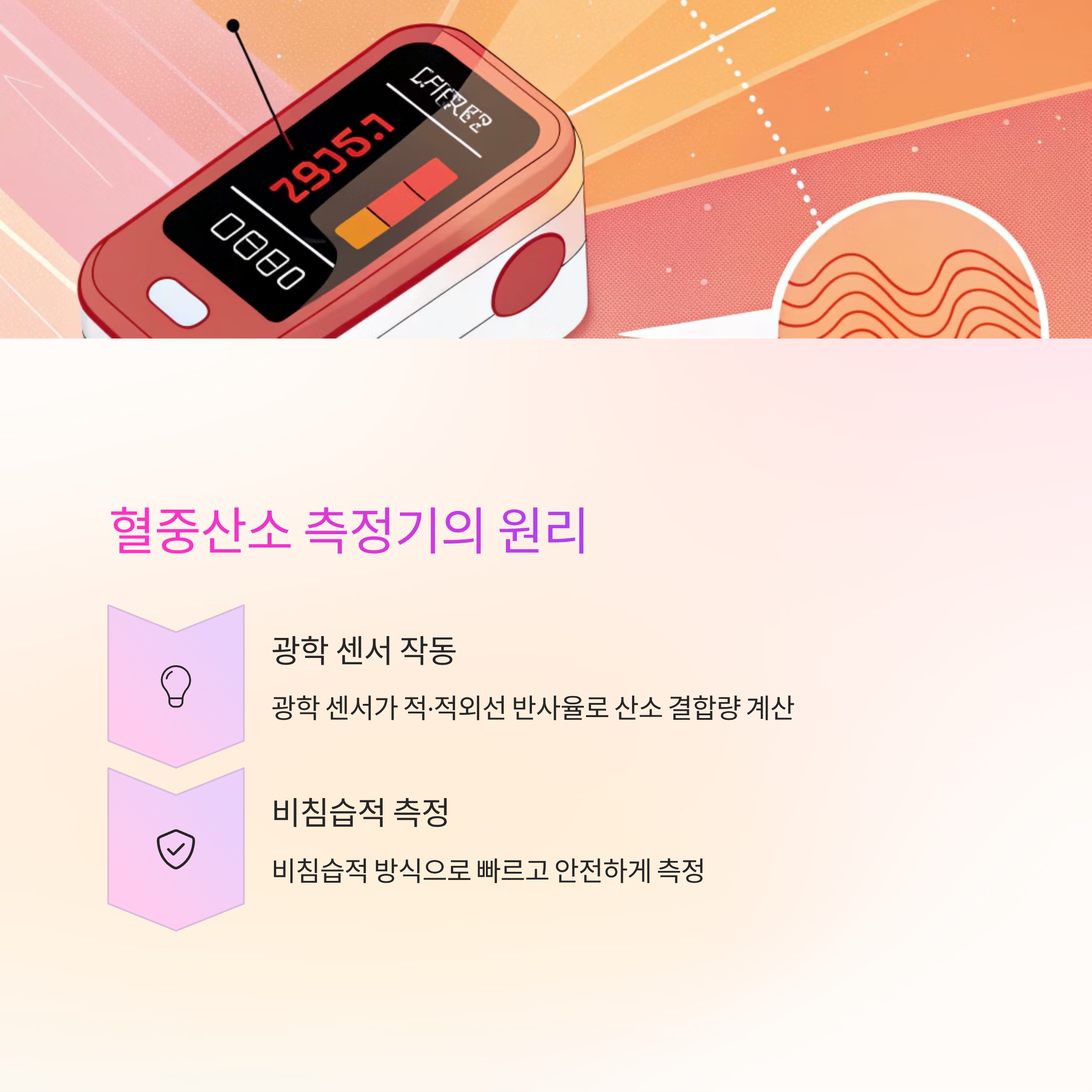 혈중산소 측정기는 광학 센서 기술(Pulse Oximetry)을 사용합니다.