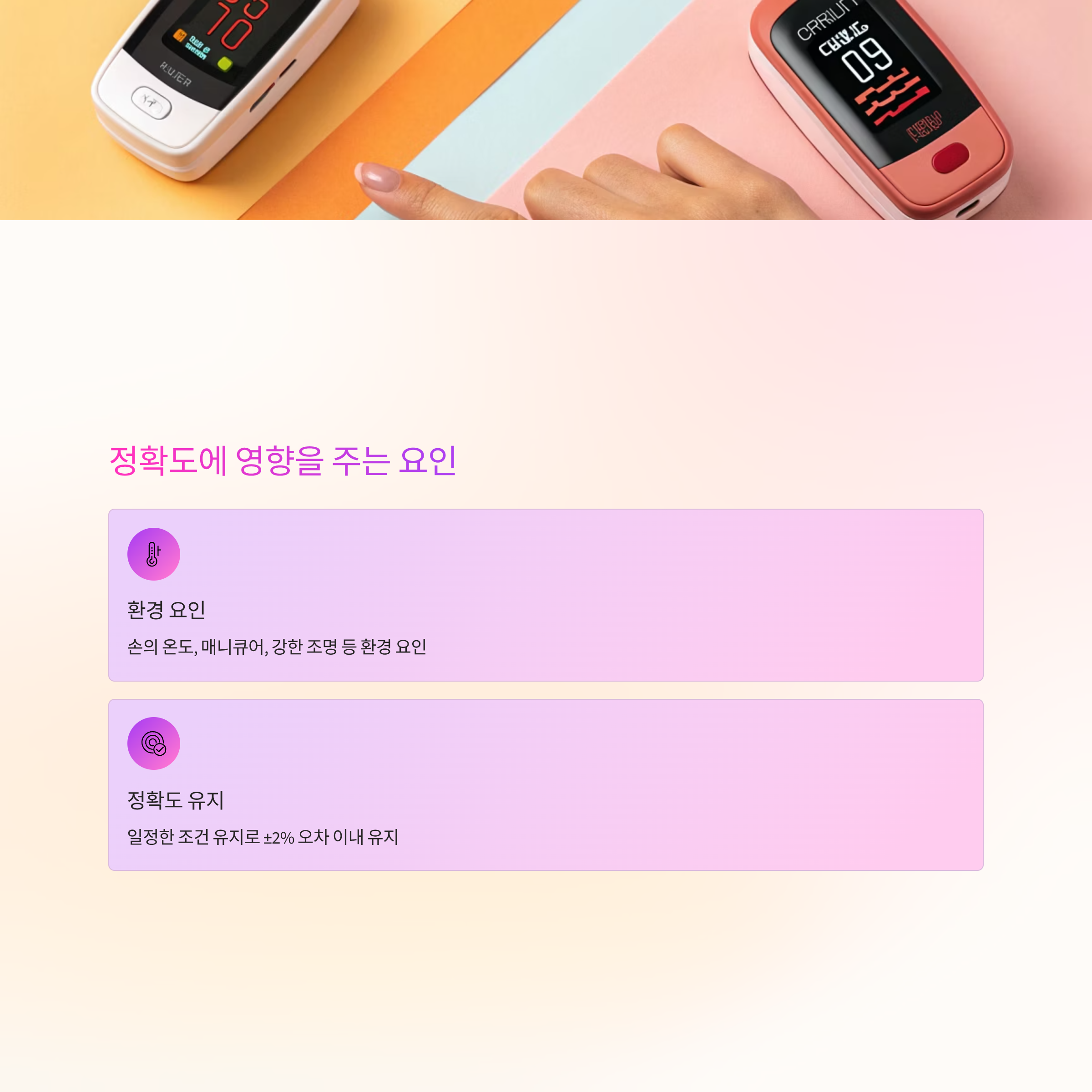 혈중산소 측정기는 환경적, 생리적 요인에 따라 결과가 달라질 수 있습니다.