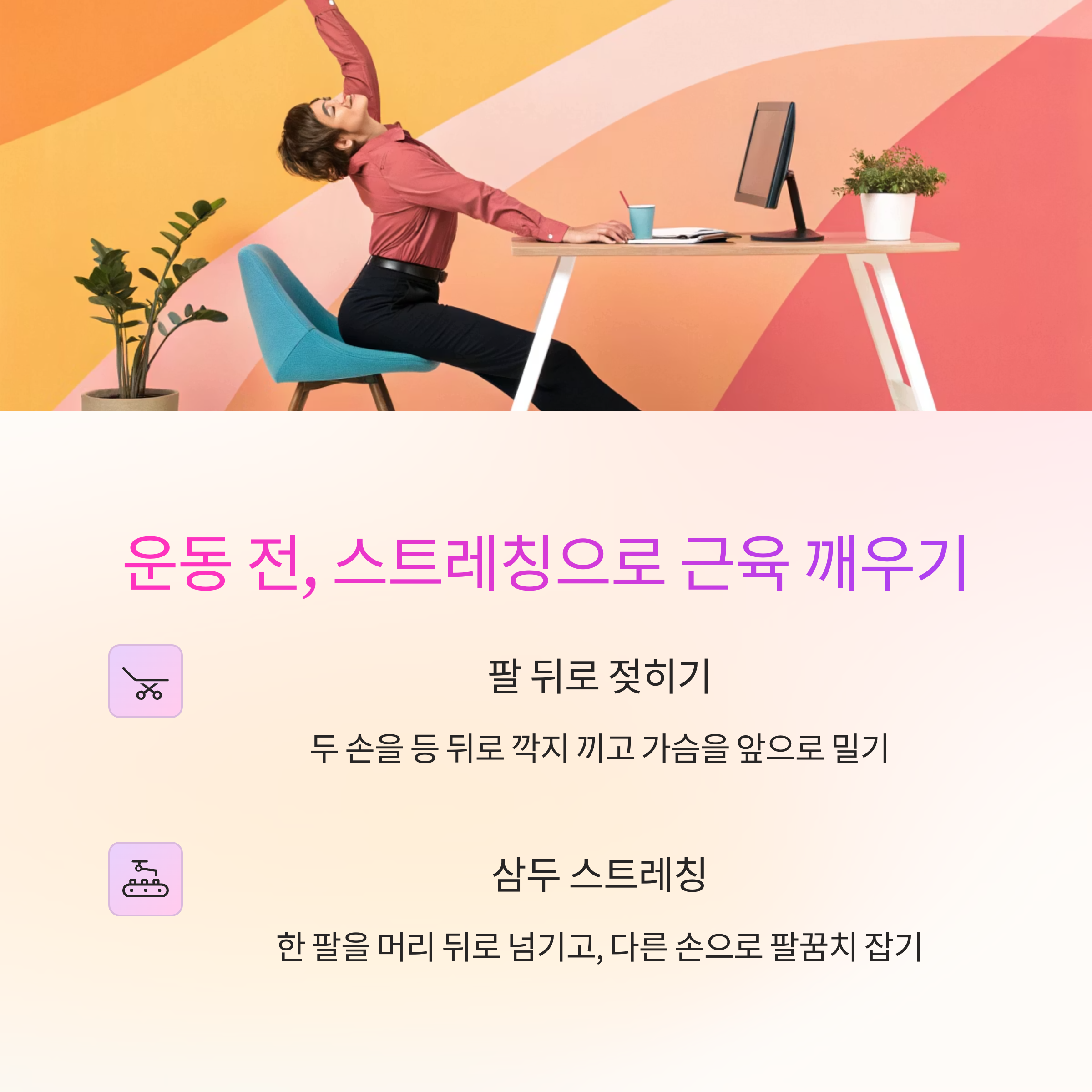 다음과 같은 가벼운 스트레칭 30초로 근육을 활성화시켜 주세요.