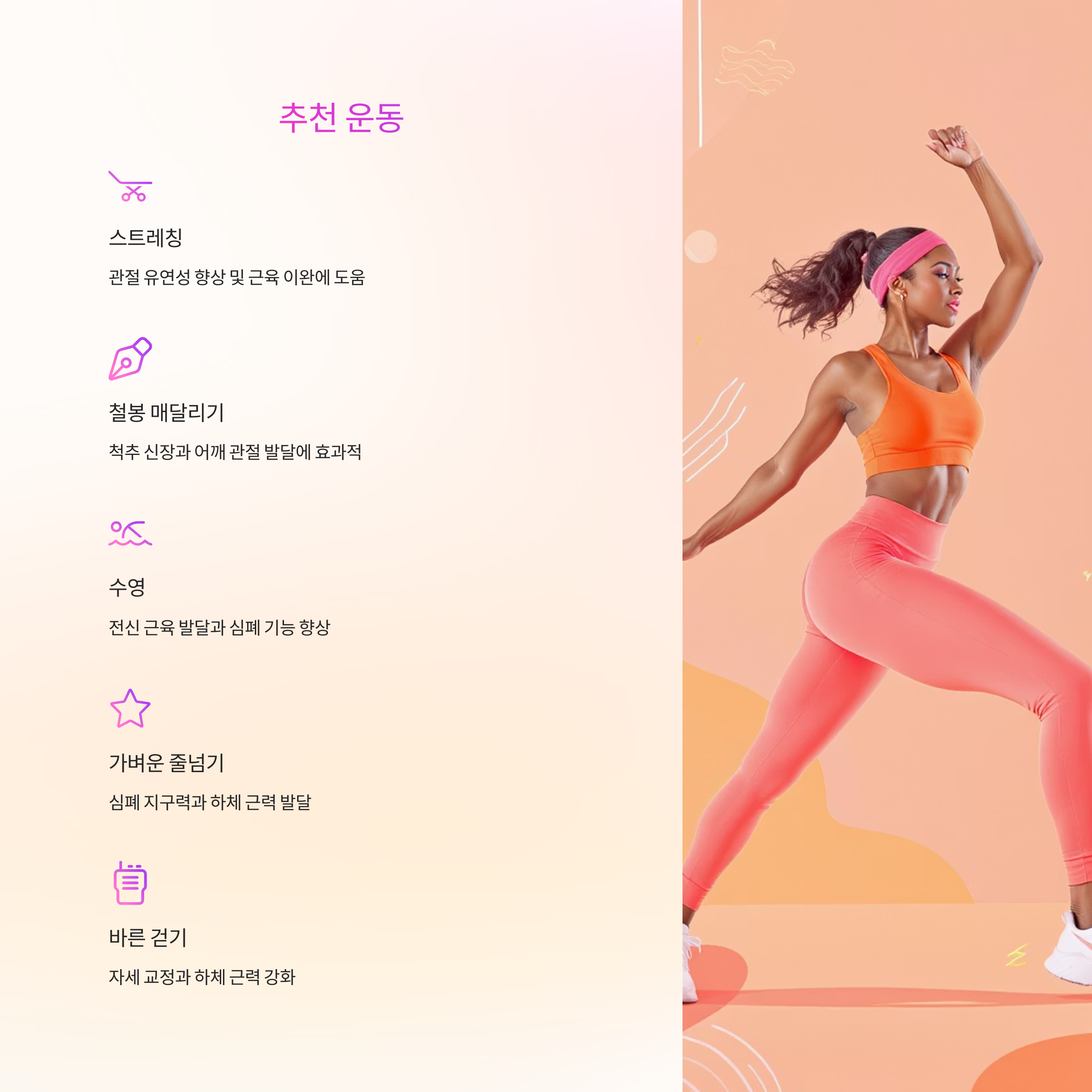 고중량 스쿼트나 반동점프는 피하고, 올바른 자세와 적당한 자극이 핵심입니다.