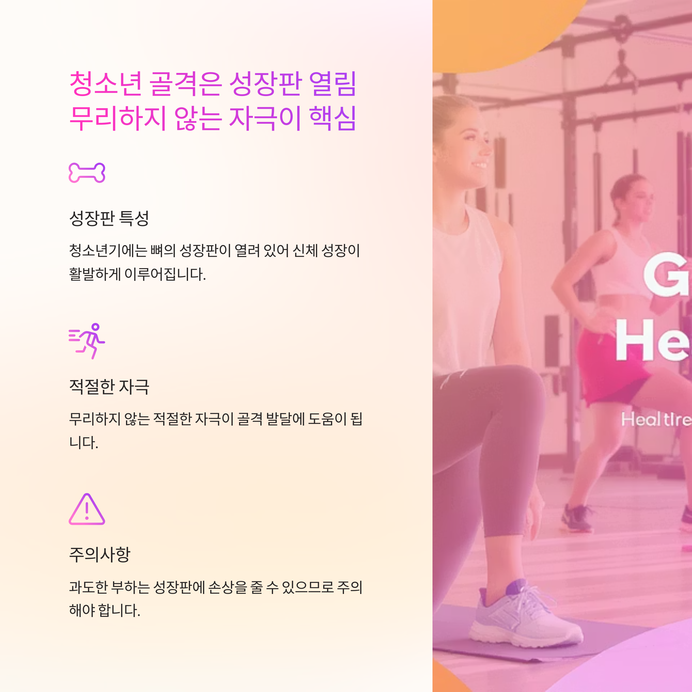 청소년기에는 골격 형성과 성장판 보호를 위한 적절한 운동과 생활 습관이 매우 중요합니다.